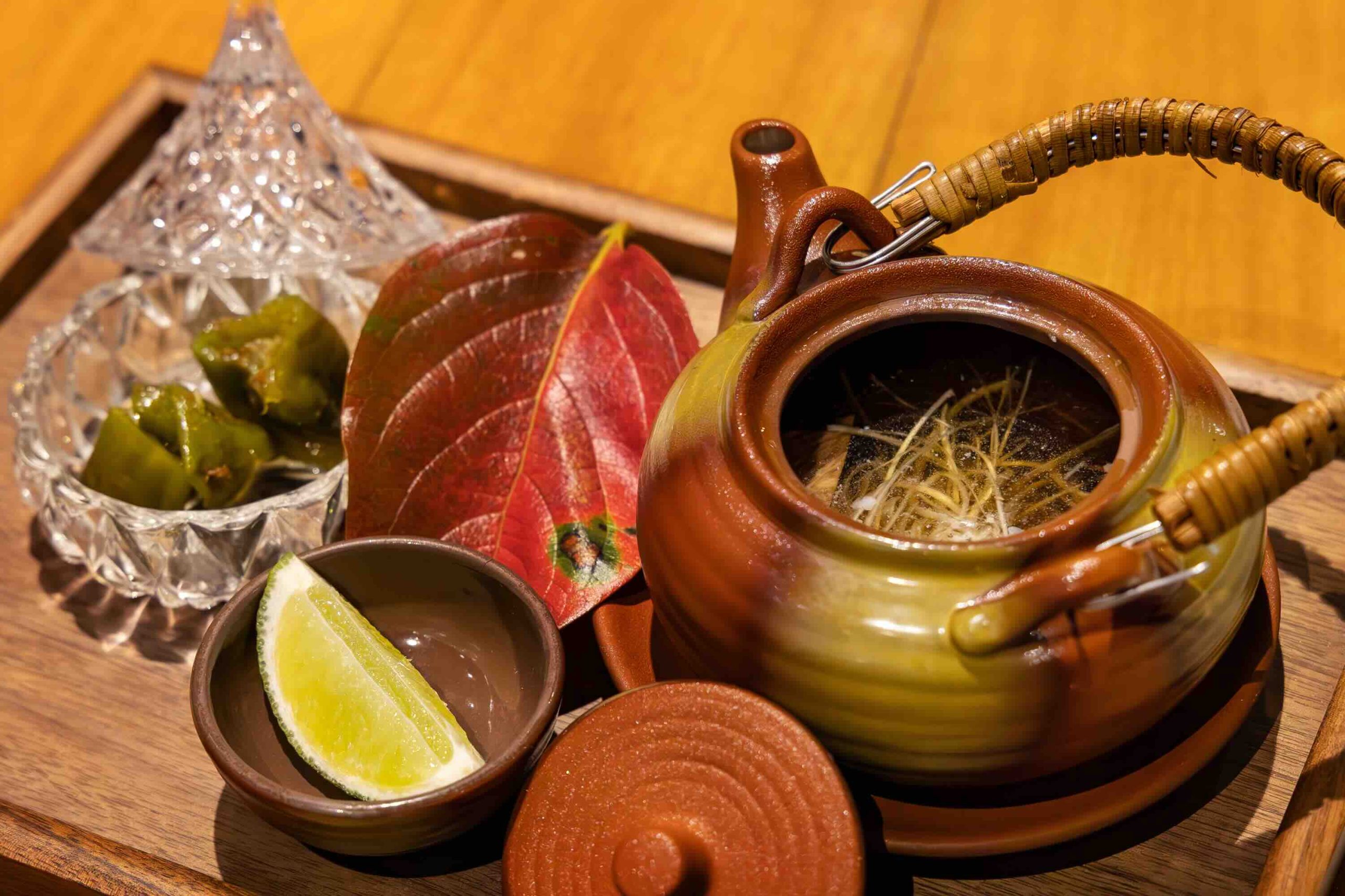 The experience opens with Wagyu & Konbu Soup with Sake, where Wagyu shank is slow cooked for six hours with kelp and sake. It is served with Kyoto sweet chilli pepper that has been deep fried and lightly simmered in soy sauce and bonito flakes, offering warmth and depth as the first introduction to the meal.