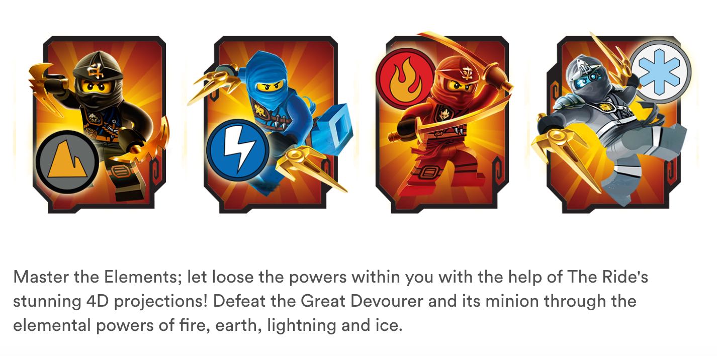 LEGO® NINJAGOTM The Ride is a fully immersive 4D dark ride inspired by the highly popular LEGO® line of NINJAGOTM toys and TV series, allowing you and your family to become your favourite characters and defeat enemies, from snake tribes, ghosts and skeletons to the Great Devourer under the guidance of Master Wu. The unique hand gesture technology by Triotech defines the experience by letting guests throw virtual projectiles with mere hands.