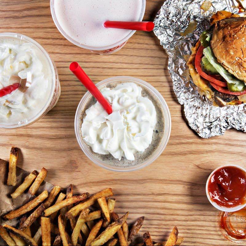 Shakes: FIVE GUYS shakes have a creamy, vanilla base. Customise them by adding one or more of the eleven premium mix-ins like crispy bacon, real bananas, fresh strawberries or cold-brewed coffee made daily in store.