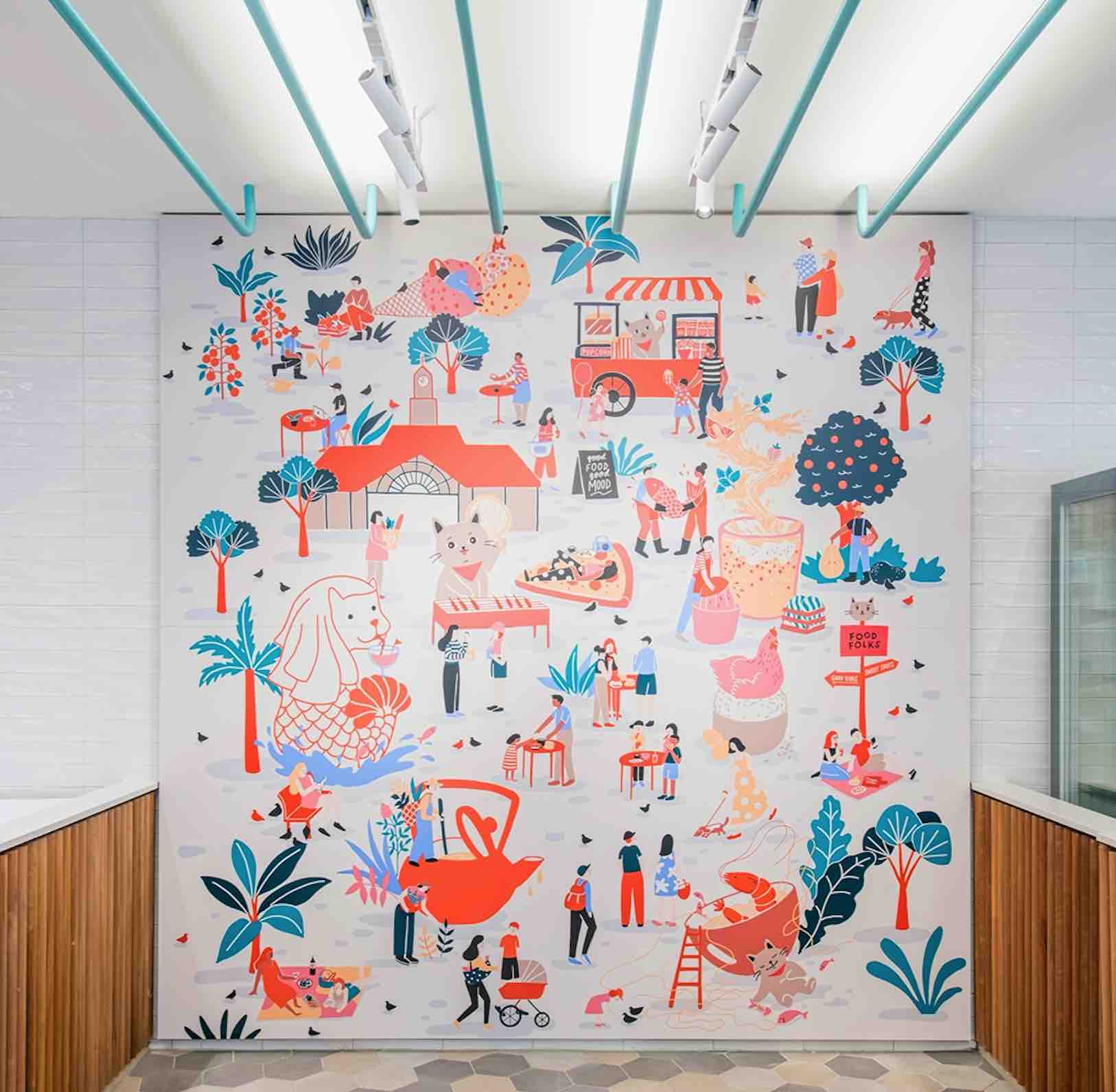 The food menus were curated using a “Customer First” principle, which was also applied in the design of the five retail zones and the three Instagram-worthy spaces, including a custom-designed mural by local illustrator, Tan Zi Xi (@MessyMsxi), and a life-sized Singapura cat-inspired mascot. Pockets of vibrant and versatile spaces have been designed for the food community to connect over a good cuppa or locally handcrafted gelato, beer and cocktails.