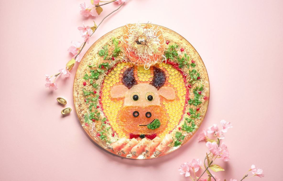 Toss to a year of good fortune and luck with Prosperity Lo Hei with Smoked Salmon and Yuzu, a cartoon-inspired yusheng meticulously decorated to welcome the Year of the Ox. Well-received and sure to bring a smile to faces, this refreshing and fruity yusheng comprises a crunchy assortment of toppings such as lotus root chips, salmon fish skin and mouth-popping caviar of passionfruit and pomegranate seeds, topped with a homemade sauce of plum, apple, pineapple, and yuzu.