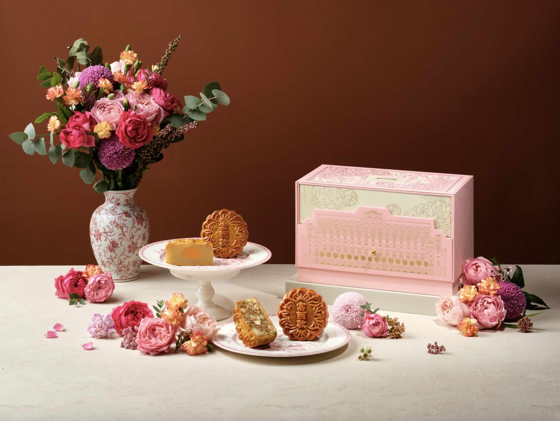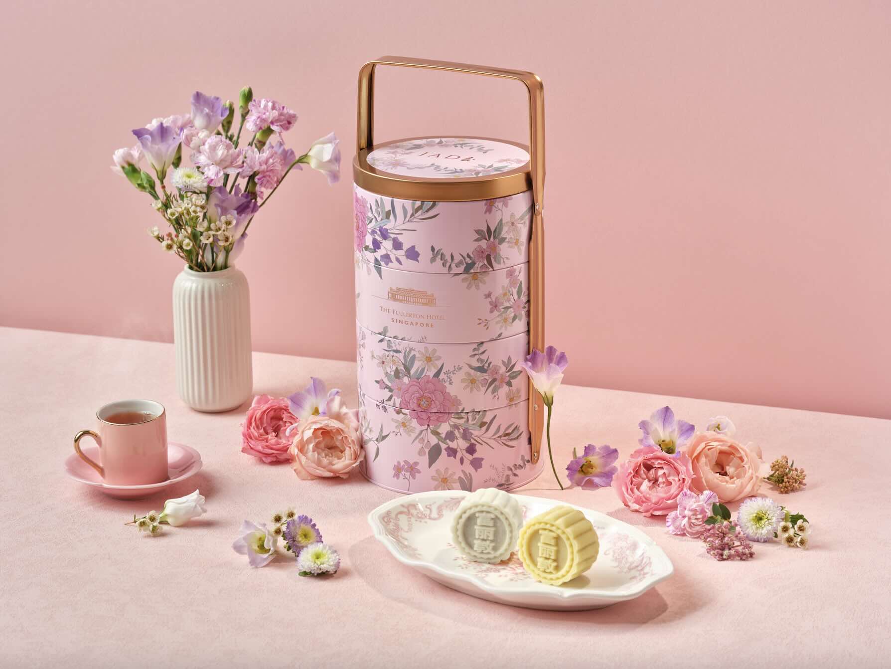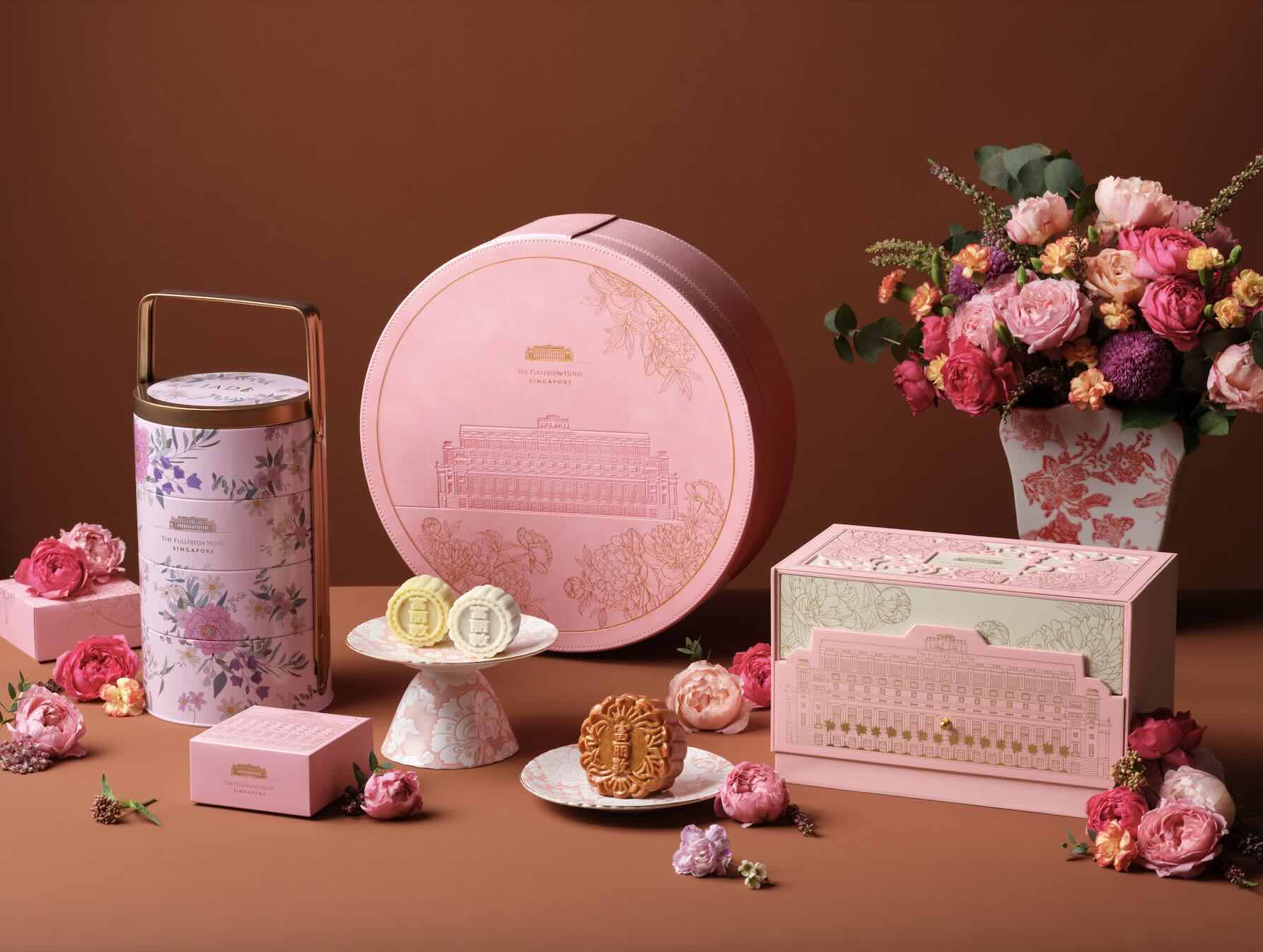 These traditional mooncakes are presented in pastel-toned drawer boxes featuring the Fullerton Building’s iconic gold façade framed by blooming peonies—symbols of prosperity and celebration.