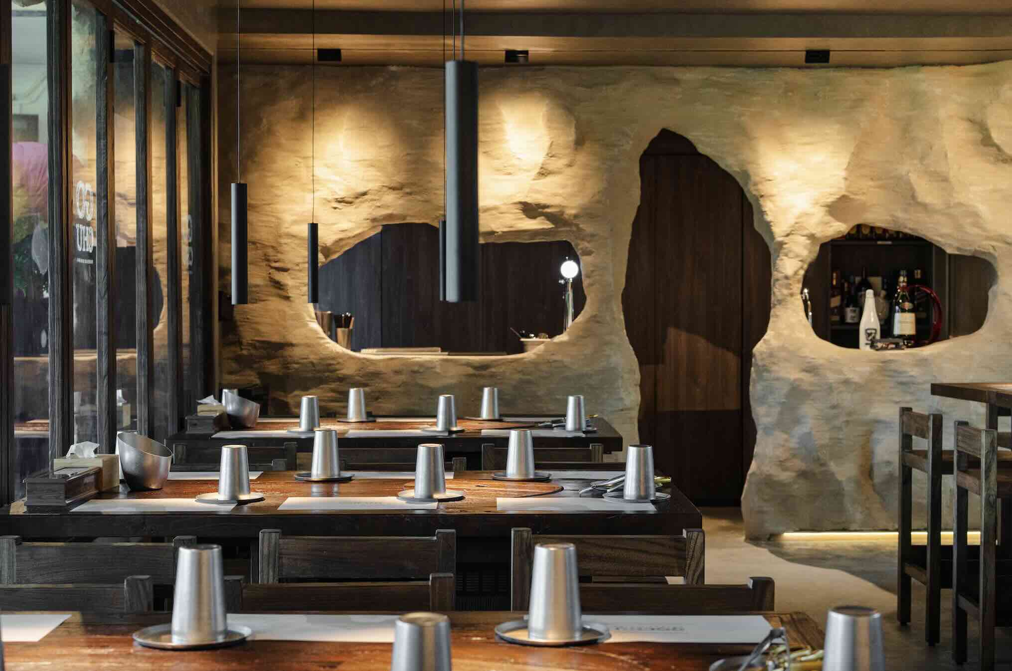 The dining space at GOCHU is just as important as the food. Designed around a distinctive cave concept, the interior features natural stone walls and softly contoured surfaces that evoke the feeling of dining within nature. Floor-to-ceiling glass panels open up views of surrounding greenery, creating a calm and immersive environment where you can fully disconnect from the city’s pace. It is a setting that encourages slower meals, deeper conversations and a sense of quiet escape.