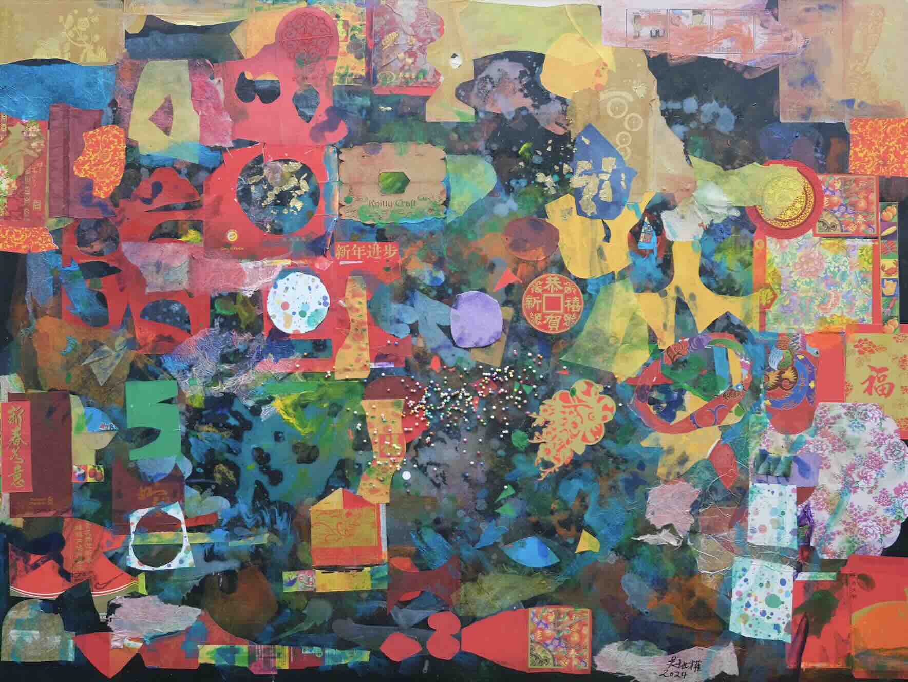 The artworks are imbued with auspicious titles, such as Abundant Wealth (金玉满堂), Auspicious and Lucky (大吉大利), Good Fortune and Prosperity (吉祥富贵) each reflecting the rich traditions of family togetherness and good fortune associated with Chinese New Year. Many of the works showcase auspicious symbols and colours, with unusual tones and juxtapositions created by Goh’s extraordinary sense of color and ability to create harmonious compositions from a myriad of materials and shapes. For example, Abundant Wealth (金玉满堂) incorporates both Chinese red packets and Malay green packets, and features double fish (双鱼), birds, and dragon motifs. This visually dynamic and harmonious artwork beautifully celebrates prosperity and the unity of diverse cultures through its intricate design of meaningful elements.