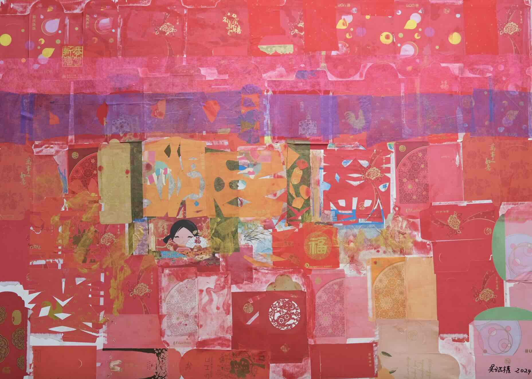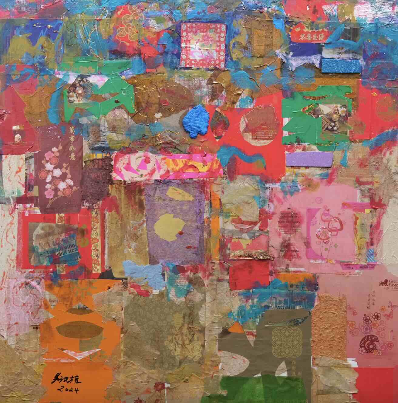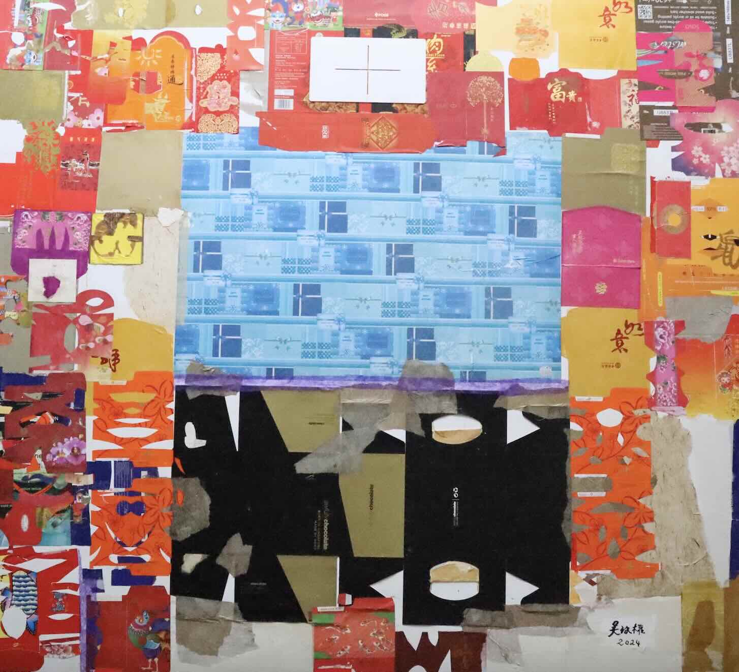 The vintage and new ang baos lend a sense of nostalgia and familiarity to each work while creating an intricate and vibrant visual tapestry of diverse textures and colours on canvas. Ba-Gua Prosperity (八卦吉祥) captivates viewers with a commanding octagonal design at its core, crafted from recycled red packets and various found materials such as Awfully Chocolate-branded ribbons and paper. The bold ba-gua shape, rich in cultural symbolism, harmoniously integrates the diverse textures and colours of the layered materials.