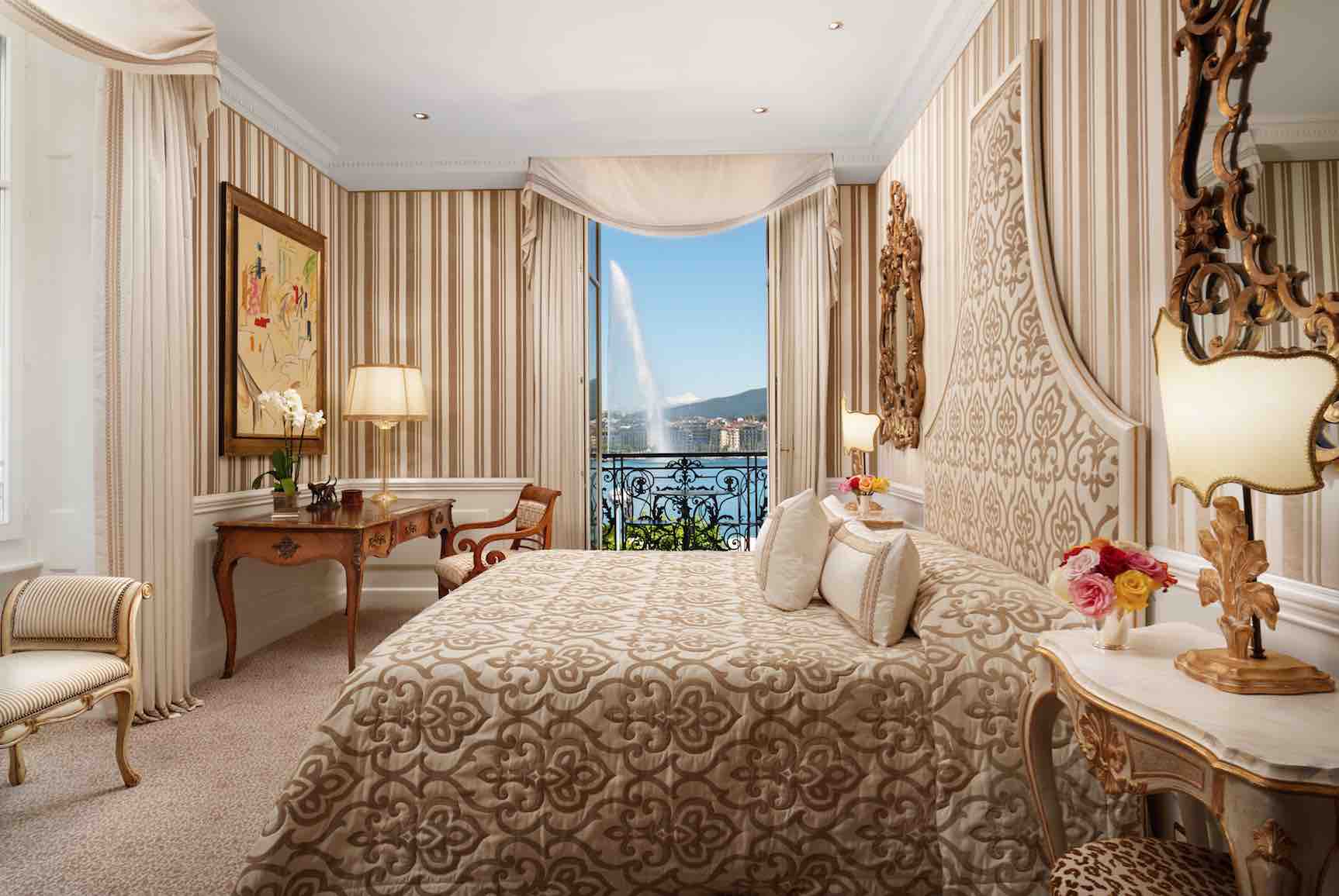 The hotel’s Presidential Suite is outfitted with bulletproof glass windows and has a dark-blue-and-white colour palette complementing the full Lake Geneva and Alps views. The 1,185 square-foot suite has its own private bar with complimentary whiskey, port and cognac, and a formal dining room for four. Michael Jackson has stayed at the suite several times and has written song lyrics, literally on its wall. Other notable guests that have stayed at the hotel include Céline Dion, fashion designer Hubert de Givenchy and novelist Alistair MacLean.