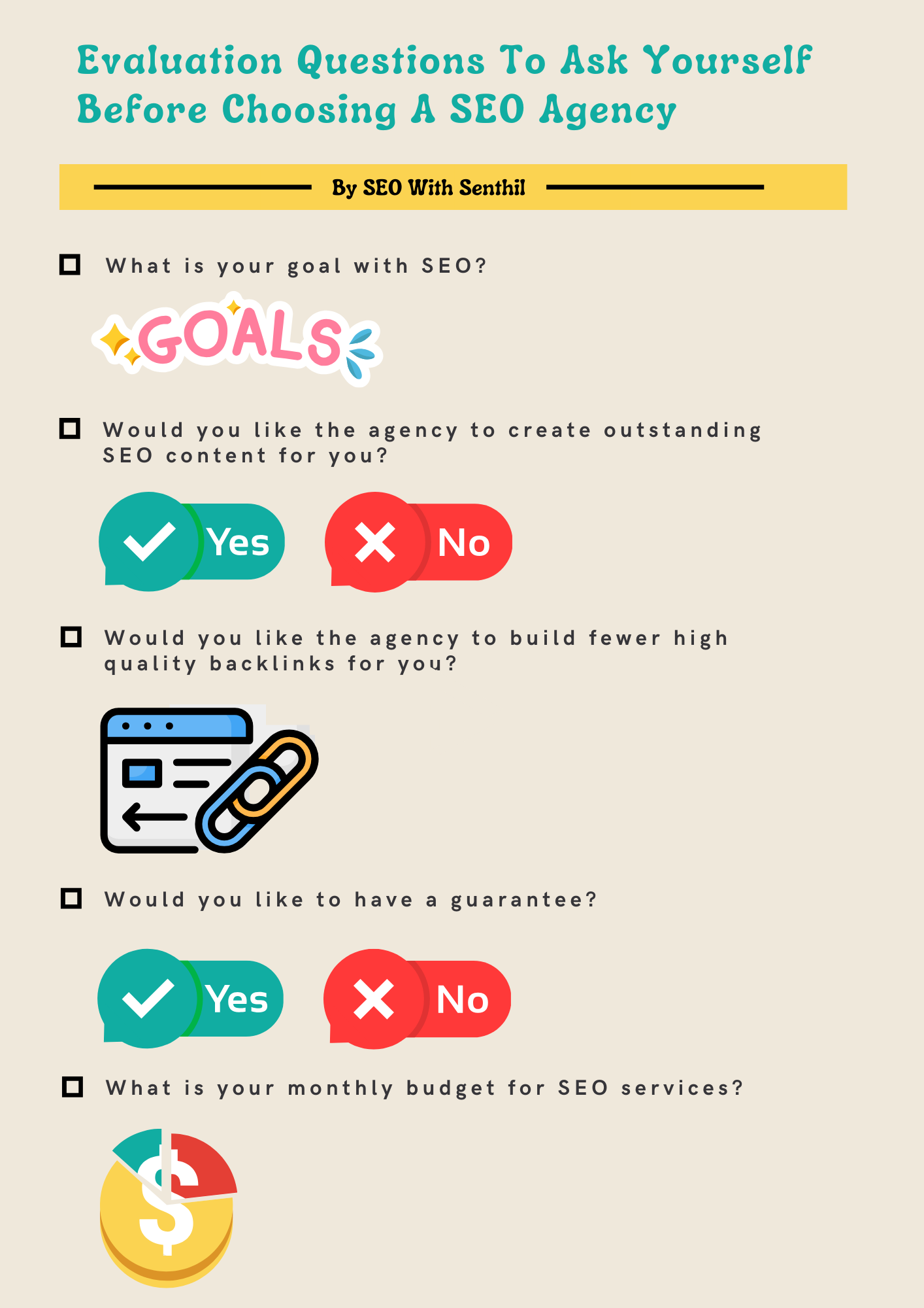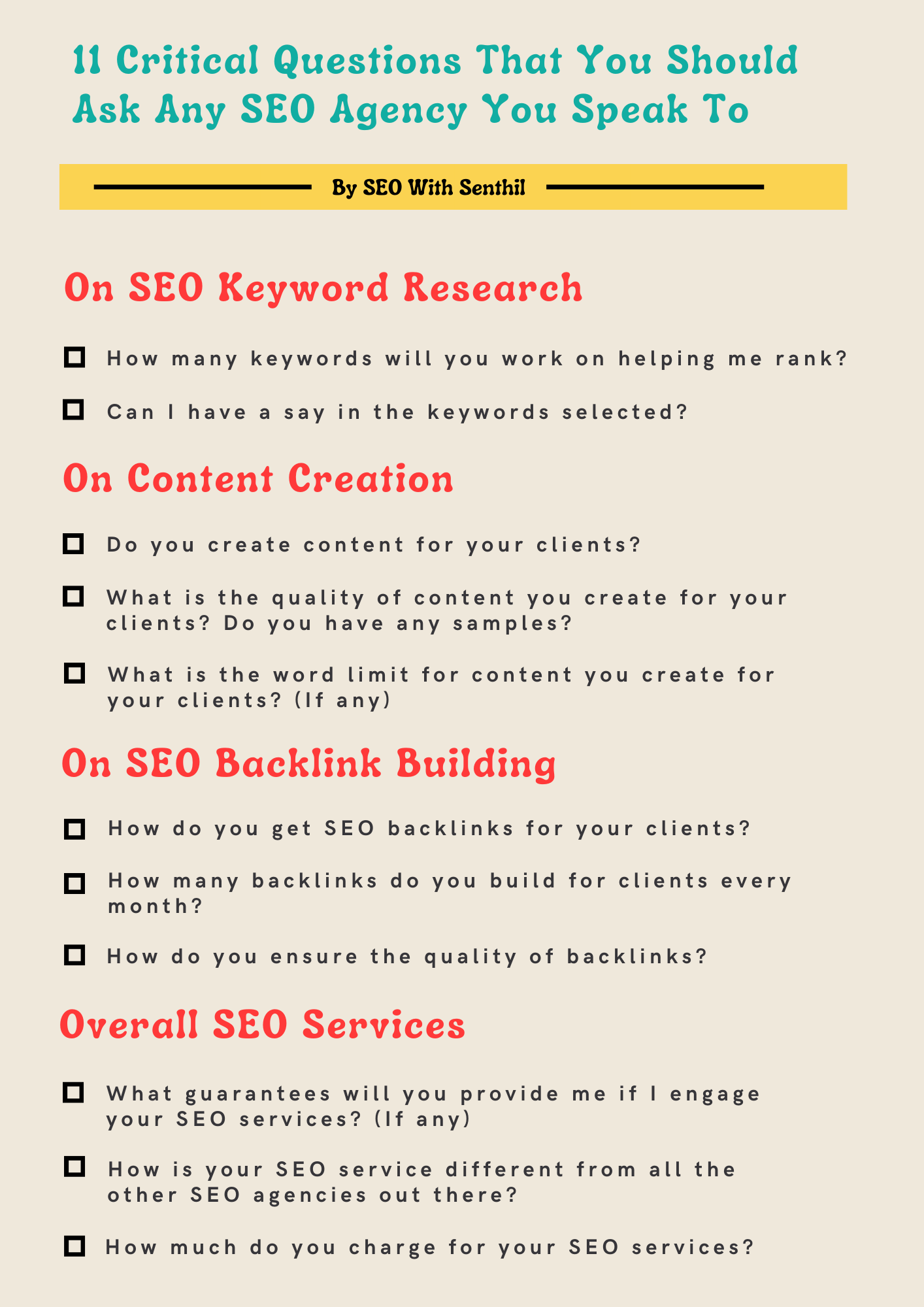 Also some SEO agencies offer Google ranking guarantees for the price you pay. And some don’t. You need to be certain which you prefer. The infographic by SEO With Senthil below highlights important questions that you can ask when selecting an SEO agency.