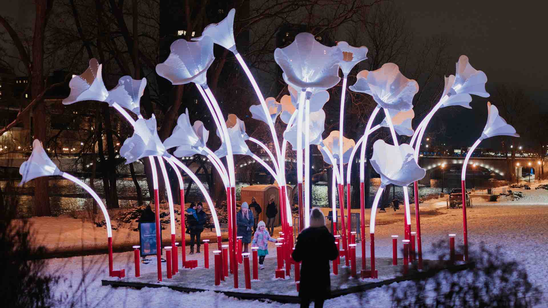 Trumpet Flowers by Sydney-based art collective, Amigo & Amigo, is a whimsical artwork that celebrates the beauty of nature by surrounding visitors with towering flower sculptures ranging from two to six metres tall, and inviting them to play with interactive keys to compose a unique sound and light show inspired by their emotions.
