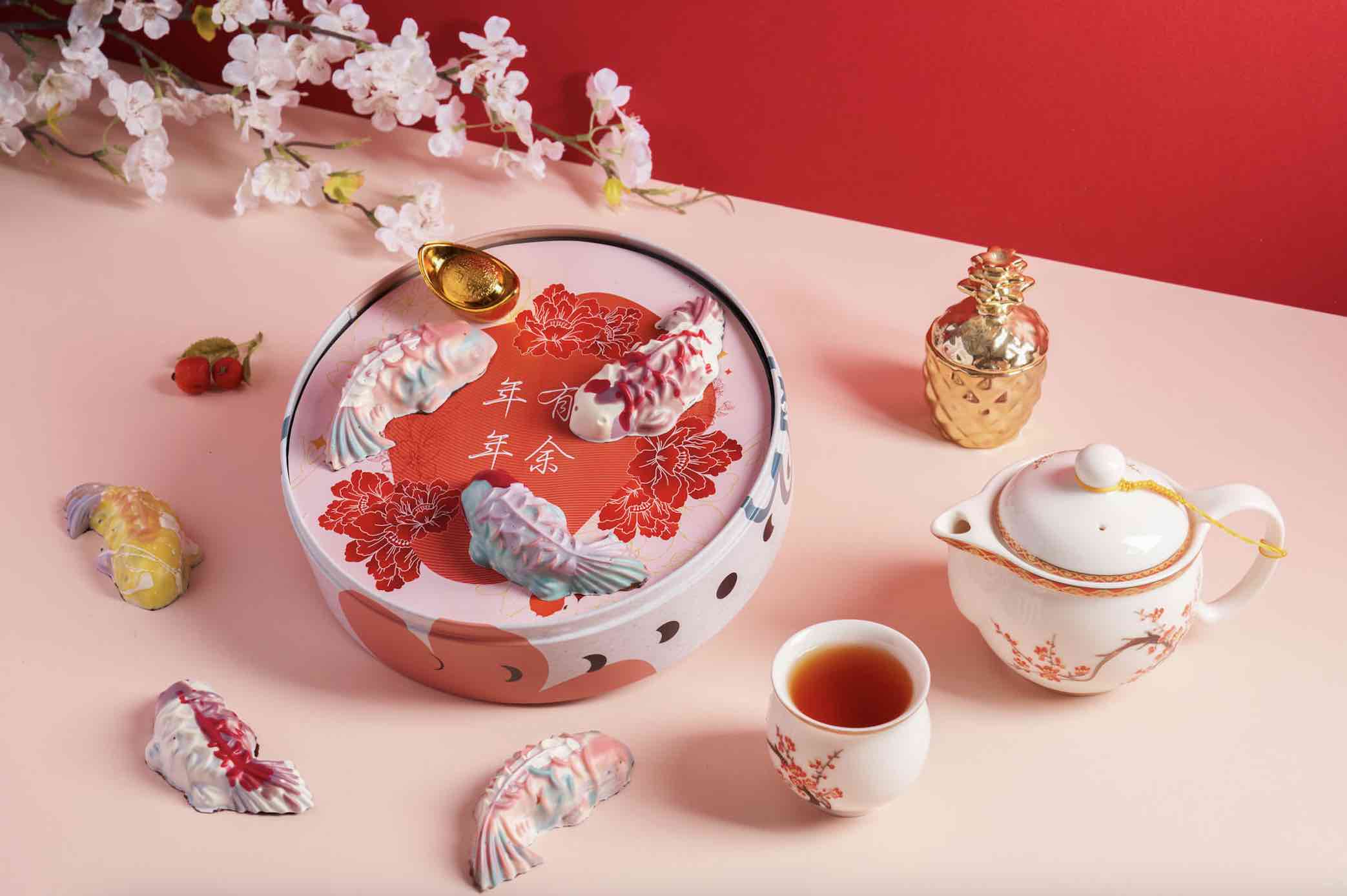 A trio of three praline Chocolate Koi Fish (S$58) convey the creative pastry chef’s wishes for good fortune and abundance for her customers in the New Year. Each Chocolate Koi is hand-painted, filled with 76% dark chocolate and packed with crunchy praline feuilletine and popping candy.