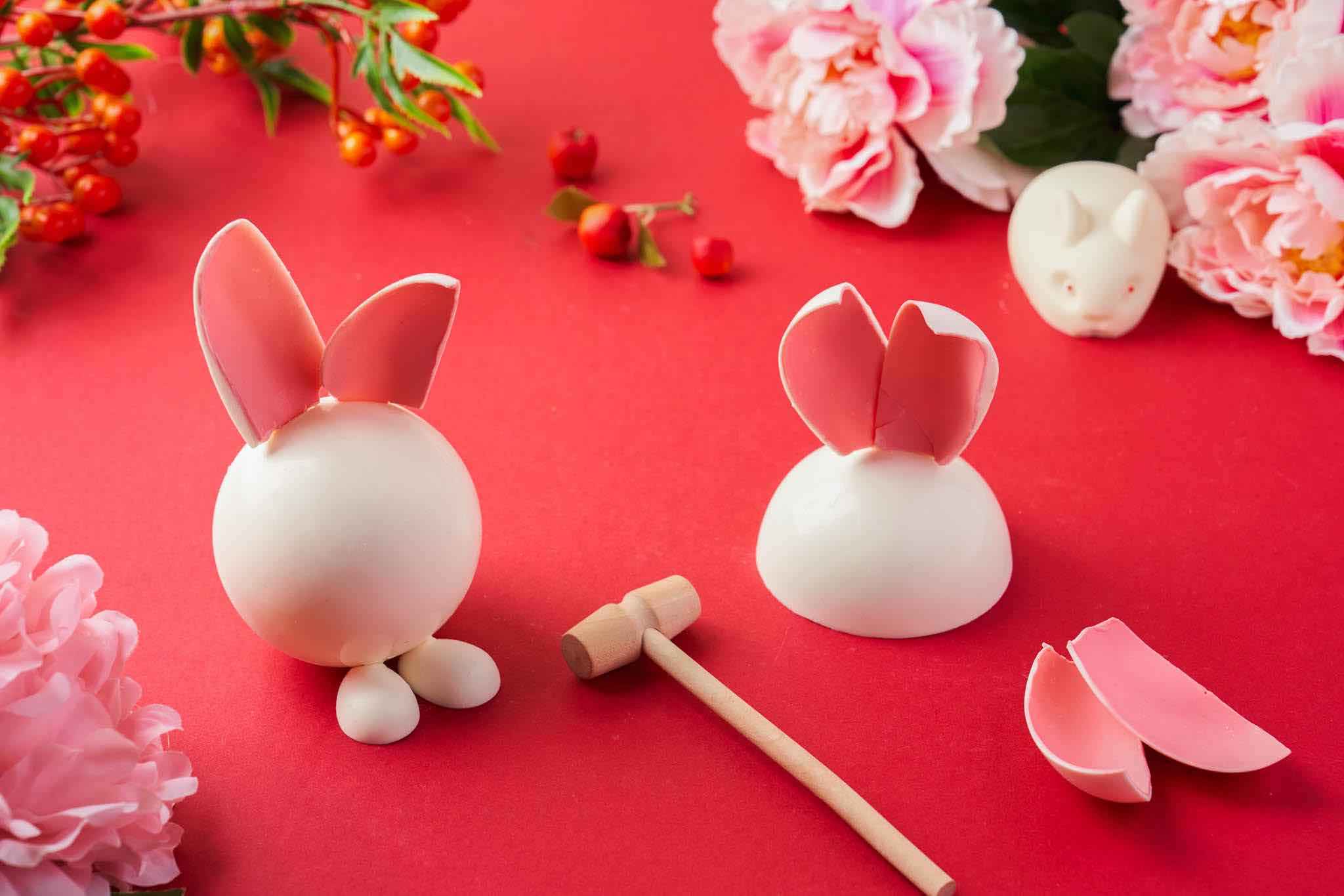 The Rabbit, a Chinese symbol of longevity, peace, and prosperity, finds shape in Janice Wong’s limited-edition Rabbit Chocolate Sculpture (S$50), which is loaded with crispy chocolate-coated nuts for all to share.
