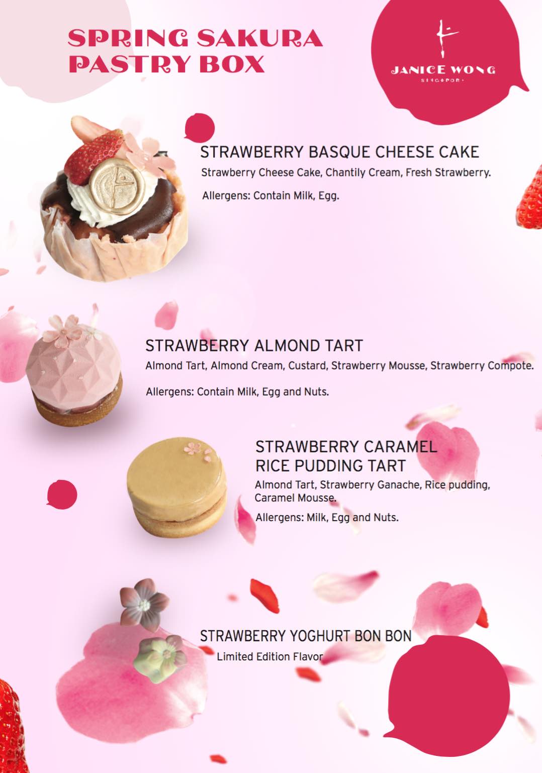 Priced at S$55, the beautifully crafted boxes are filled with items such as the Strawberry Basque Cheesecake, topped with Chantilly Cream and Fresh Strawberries. The Strawberry Almond Tart made with almond cream, custard, strawberry mousse and strawberry compote, the Strawberry Caramel Rice Pudding Tart, an almond tart made with strawberry ganache, rice pudding and caramel mousse and complemented with the Sakura-shaped Strawberry Yogurt Bon Bons.