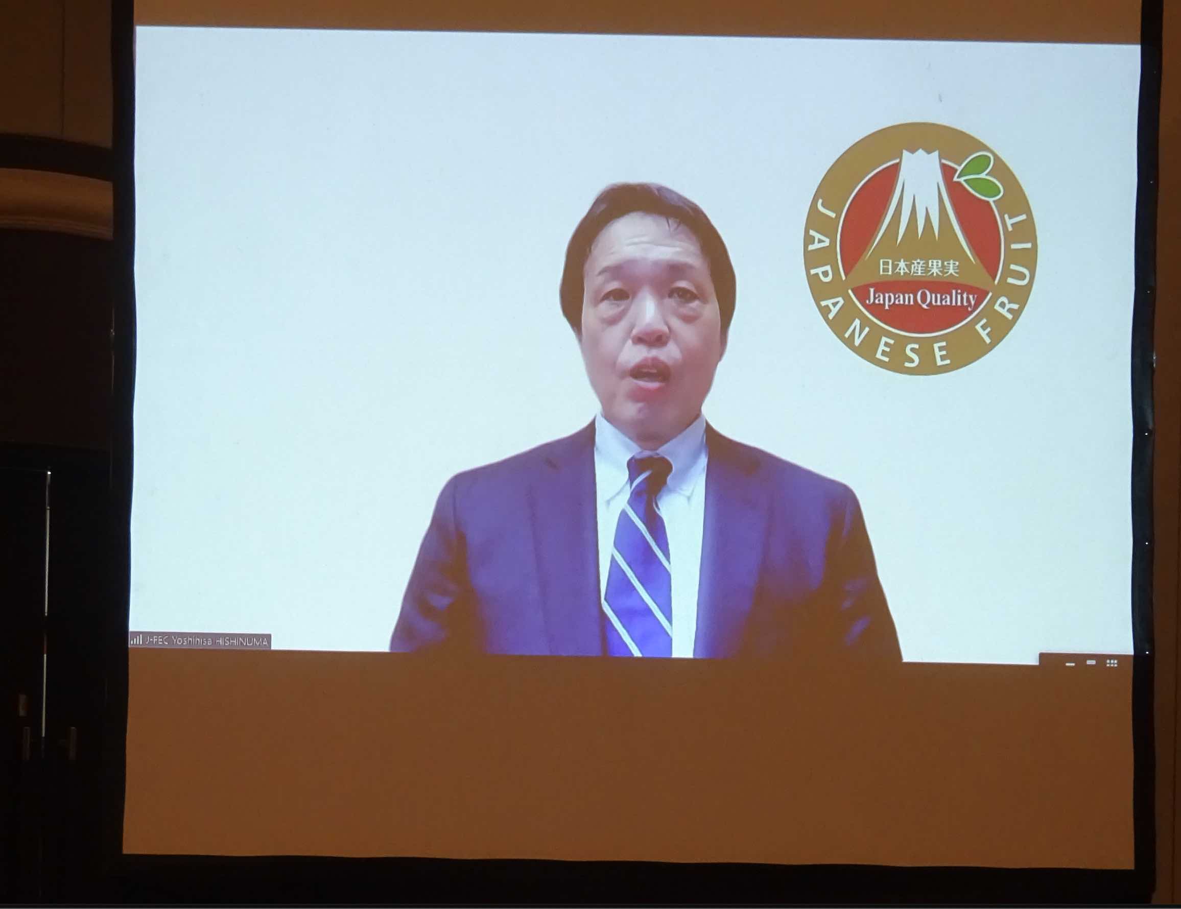 The event started with a virtual opening address by Mr. Yoshihisa Hishinuma, Chairman of J-FEC and the organizer of this event. He proudly said, “The reason why the taste, quality, safety and security of Japanese fruits are highly appreciated around the world is because of the artisanship of the producers who care for them, and they are ideal as gifts and souvenirs for your loved ones. I hope that everyone who attends this event will enjoy the wonderful taste of Japanese fruits and share the stories with their consumers!”