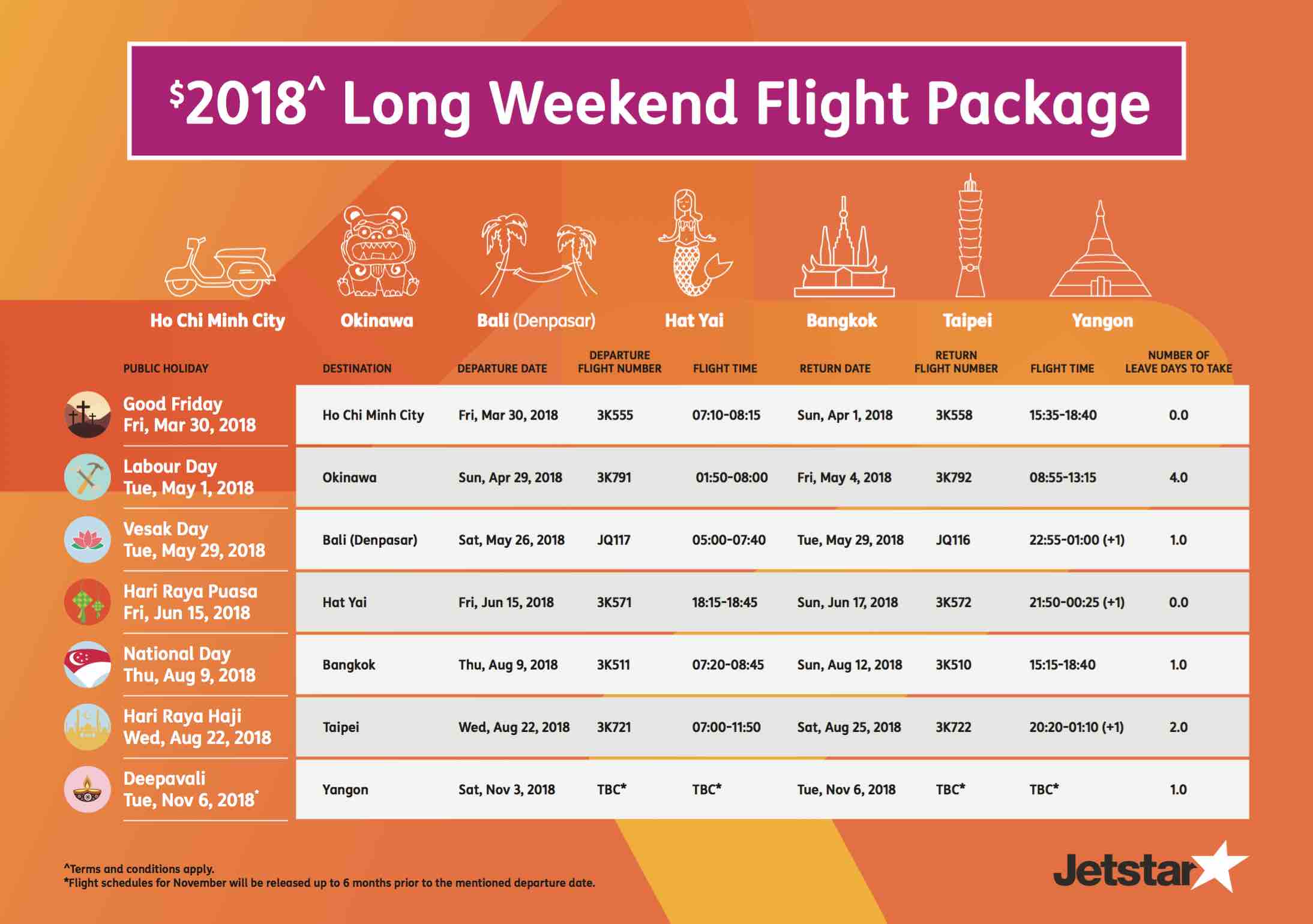 The package price of S$2,018 per person is inclusive of taxes, fees, credit card booking fees, and 20kg checked baggage allowance for all seven return flights. This flight package will be sold on a first-come-first-served basis, limited to four packages per customer. The form to indicate interest will be available at 10am on Monday 11 December at jetstar.com/2018-long-weekends