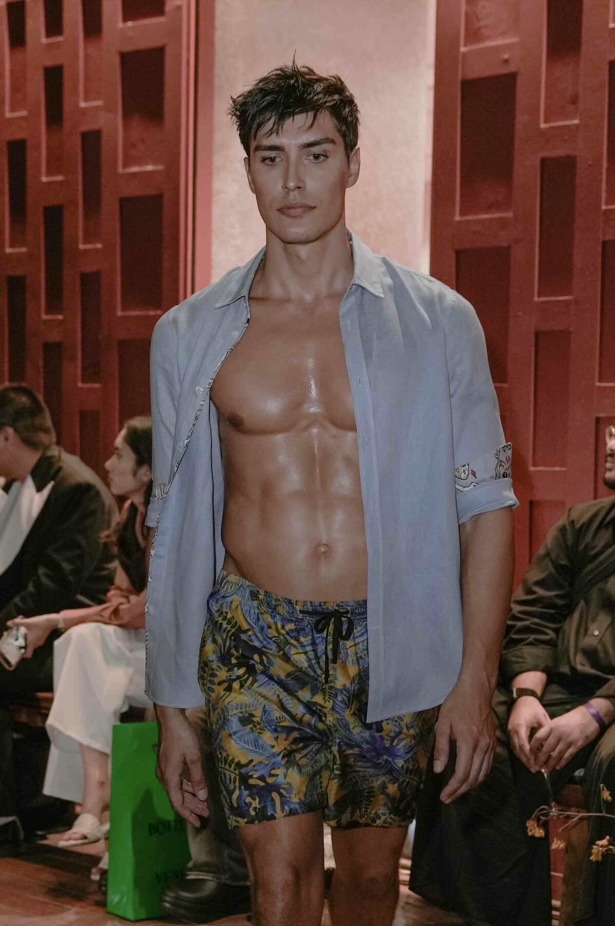 Women’s wear returned with the Solid Linen Loose Ruffle Neck Blouse and Silk Rope Drawstring Shorts, a canvas of vivid yellow and white floral print, accessorised with woven handbags and scarves.