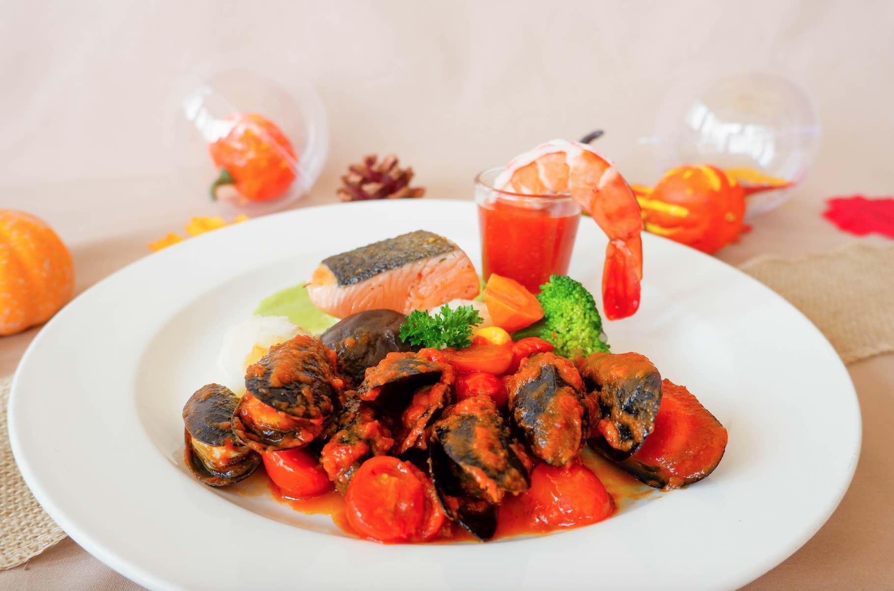 Alternatively, double up on incredible flavour with the fragrant and delicious Hearty Meat Platter. The savoriness of the grilled lamb rack, sweet smokiness of the slow-braised barbecue pork ribs, and an oozy poached egg create a mouth-watering whole that is more than the sum of its parts. The Bountiful Seafood Catches is a crowd-pleaser for the seafood-lovers. The combination of Ora King Salmon, Jumbo Shrimp and sautéed Mussels in Pomodoro sauce make for an indulgent alternative to more traditional turkey and stuffing.