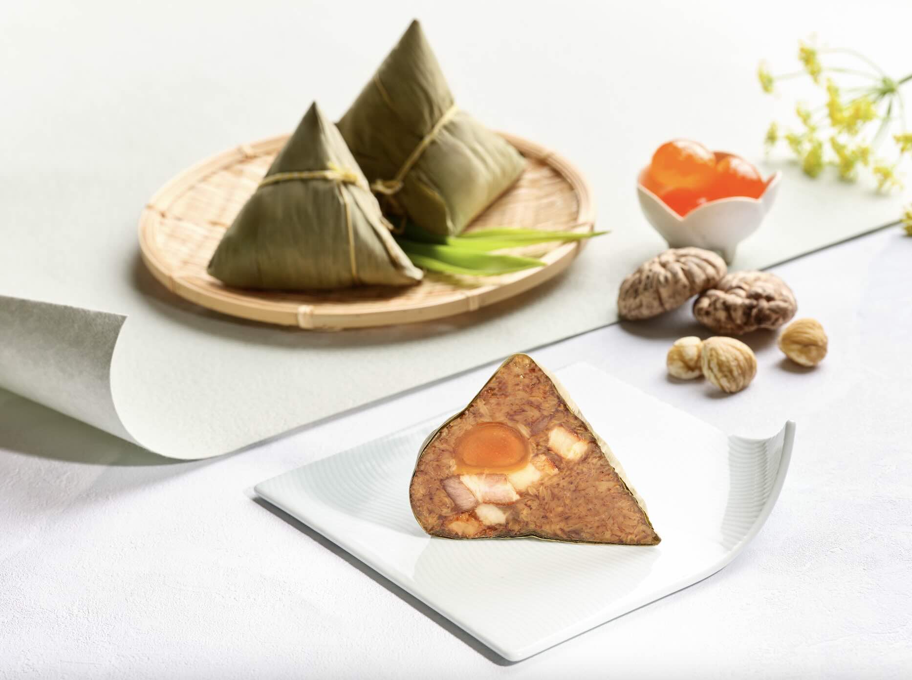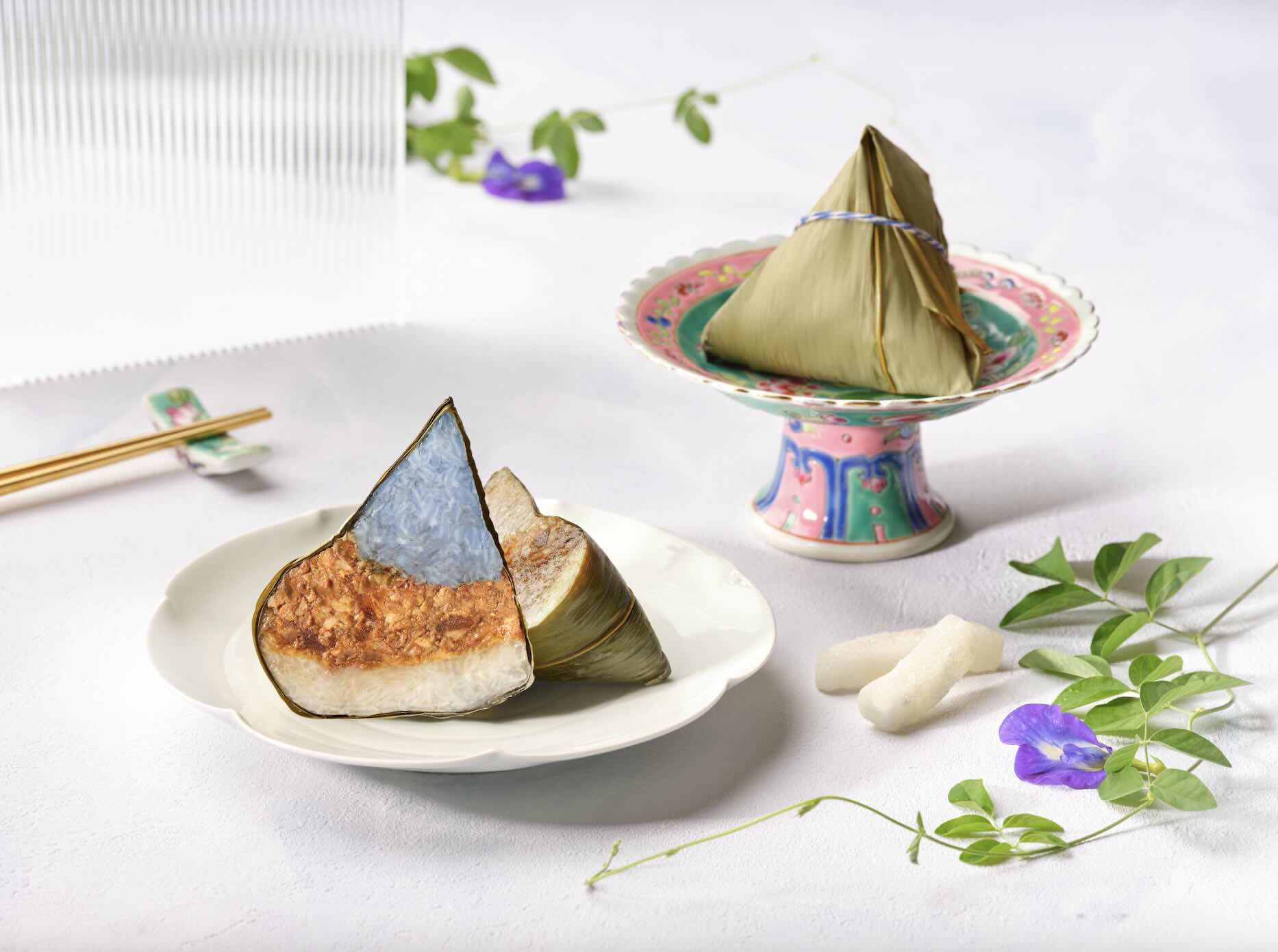 This year’s locally inspired rice dumplings include two returning flavours and a new addition. Back by popular request, the Blue Pea Nyonya Rice Dumpling 蝶豆娘惹粽 (S$18 nett) contains a savoury-sweet filling of minced pork, mushrooms, and candied winter melon, while natural dye extracted from butterfly pea flowers imparts a lovely blue hue. A staple of the occasion, the Hokkien Salted Egg Yolk Rice Dumpling 福建黄金咸蛋鲜肉粽 (S$18 nett) reveals a classic combination of braised pork, mushroom, chestnut, and salted egg yolk.