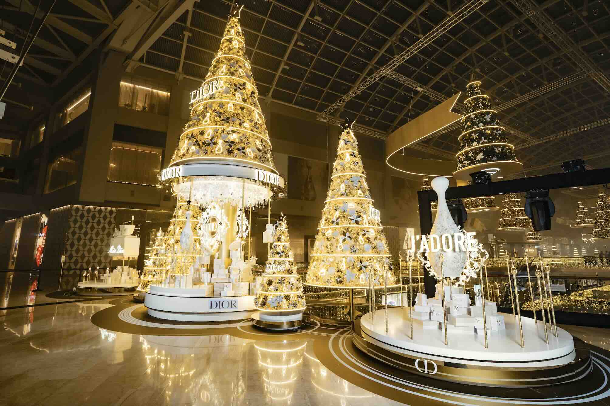 Inspired by the gates of Les Tuileries Garden and designed by Italian visual artist Pietro Ruffo, the installation also features a magical carousel where Dior Beauty’s iconic fragrances are presented as larger-than-life sculptures or nestled in coffrets that open like musical boxes. Across the property, some 300 sparkling trees wrapped in bountiful red and gold ribbons invite visitors to unravel the joy of the festive season at every turn.