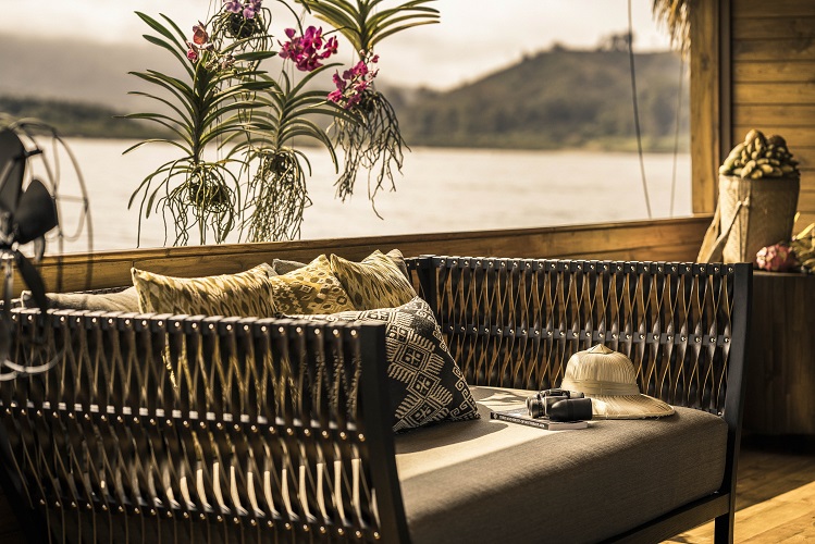 Wood and thatch throughout blend seamlessly with the verdant surrounds of the mighty Mekong River’s shores through floor-to-ceiling windows and from open sun decks. The boat’s contemporary designed interiors feature tongue and groove wood panelled ceilings, floors and walls; etched wooden cupboards and closets; solid wood tables; dark woven leather seating; and oversized bamboo daybeds. Local handwoven ornaments adorn the spaces and freshly cut flowers create a naturally soothing ambience, while Thai silk and fabrics drape the furniture in bold colours and lustrous appeal.