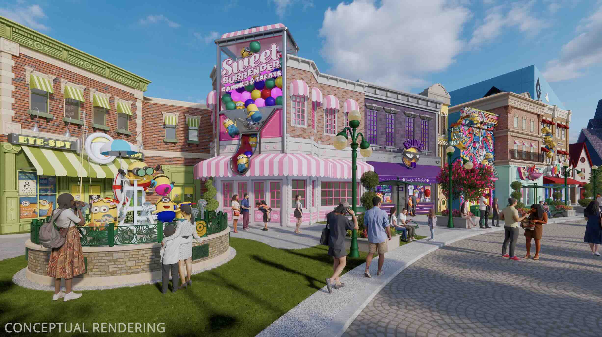 - Sweet Surrender: A candy-themed store topped with a giant jawbreaker vending machine and filled with Minion-themed apparel, plush toys, homeware, confections, and other fun souvenirs.