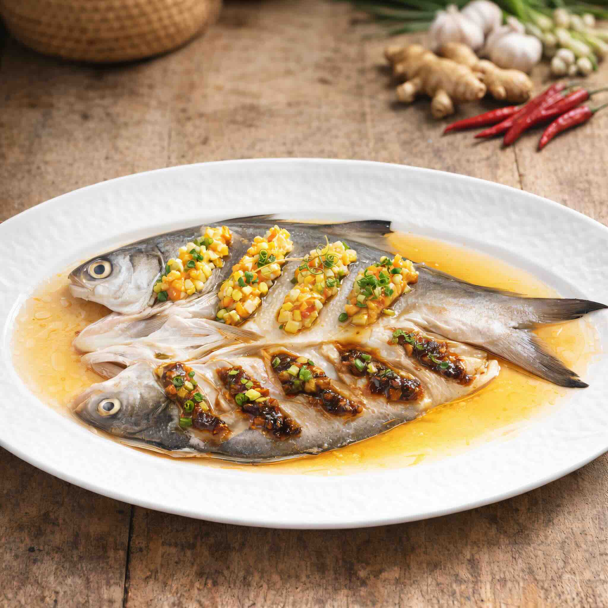 Seafood continues to play a vital role in the Chinese New Year menu, reflecting Hainan Island’s long coastline and prized fishing grounds. Baby Threadfin, known for its delicate texture and natural sweetness, appears in several preparations, including with assam sauce and yellow lantern chilli, or simply steamed with black bean sauce and lotus leaf to preserve its original flavour.