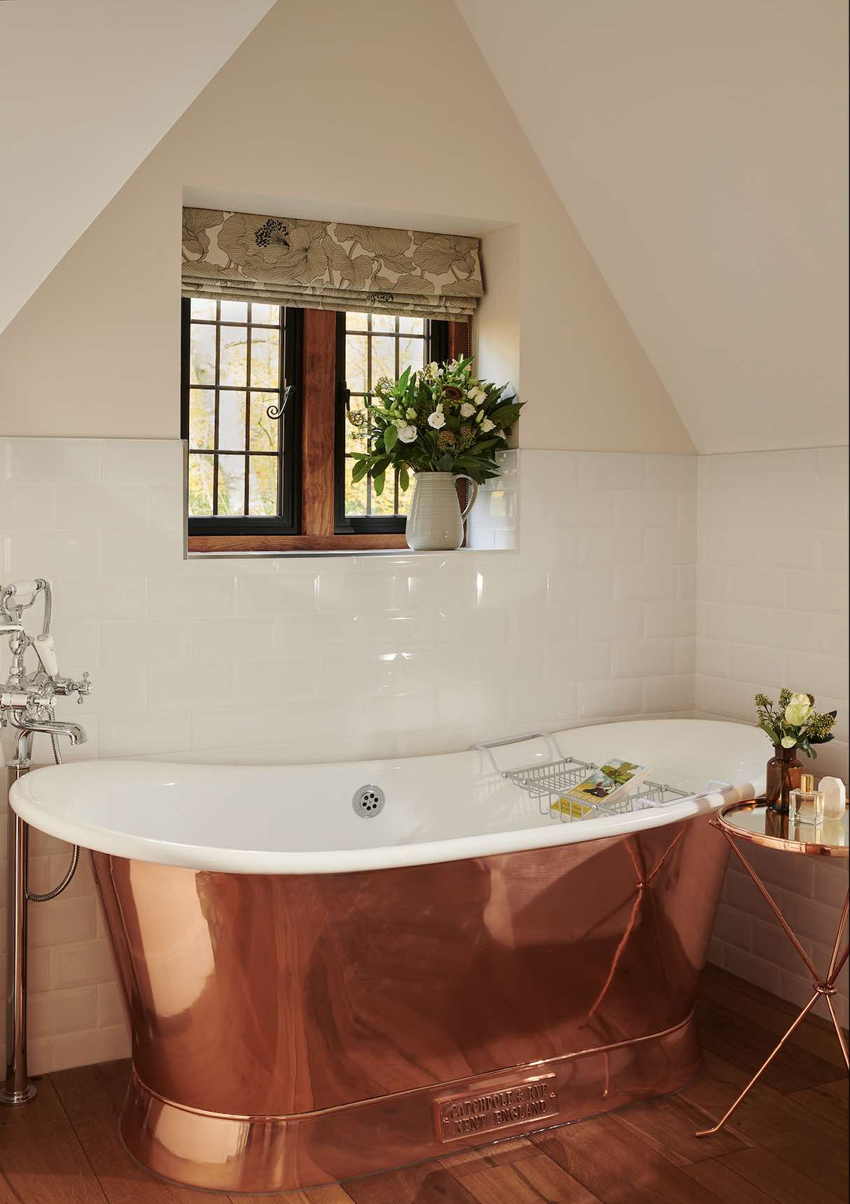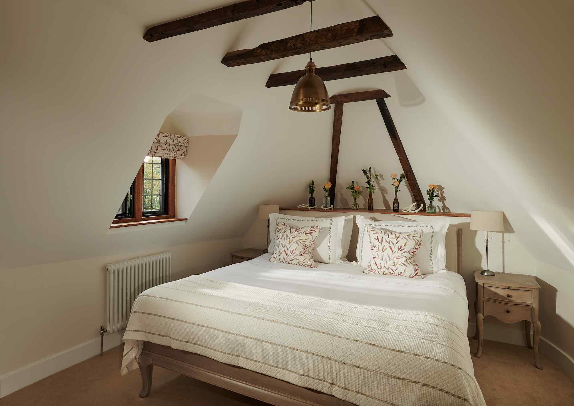 The master bedroom is a large airy suite with a super king-sized bed, high ceilings and dual aspect views of the meadow and the private garden. An en-suite bathroom features a signature Coworth Park copper bathtub, double vanity, and a large walk-in shower. The Turret room features a king-sized bed, a walk-in dressing area and an en-suite bathroom with a signature copper bathtub. A further double room, known as the Snug, has views across the wildflower meadow and a family bathroom adjacent to it.