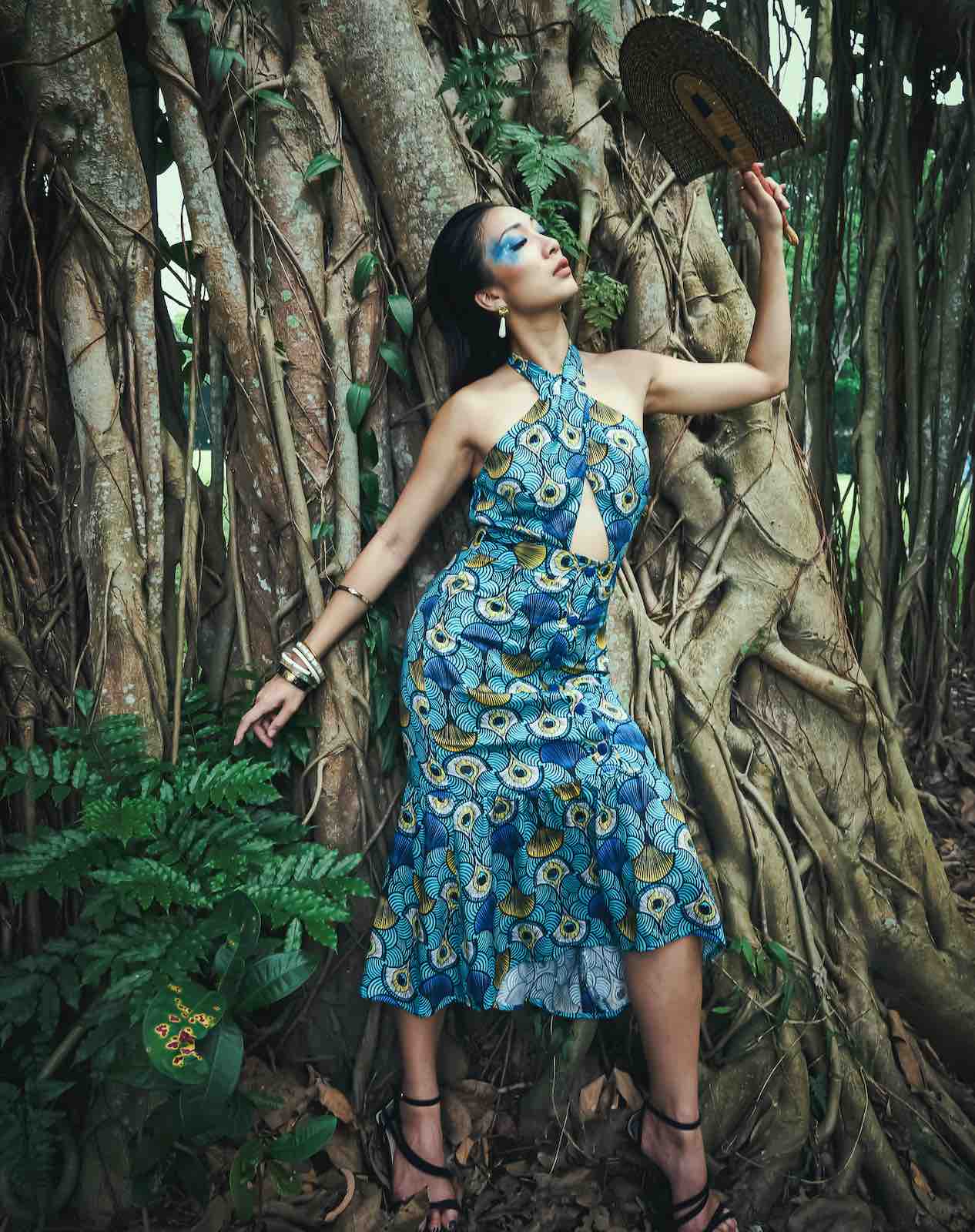 Singing to the tune of Ubby’s vision for AJO AYE, the collection empowers women to own and cultivate their unique paths. Fresh and versatile, the Sakuya-Hime one-shoulder mini dress introduces the blossom princess of Shinto, a symbol of delicate earthy life and avatar of Japanese life. Crafted with the Asa Hana print, the sleek, asymmetrical construction comes with tie-up strings on the side.