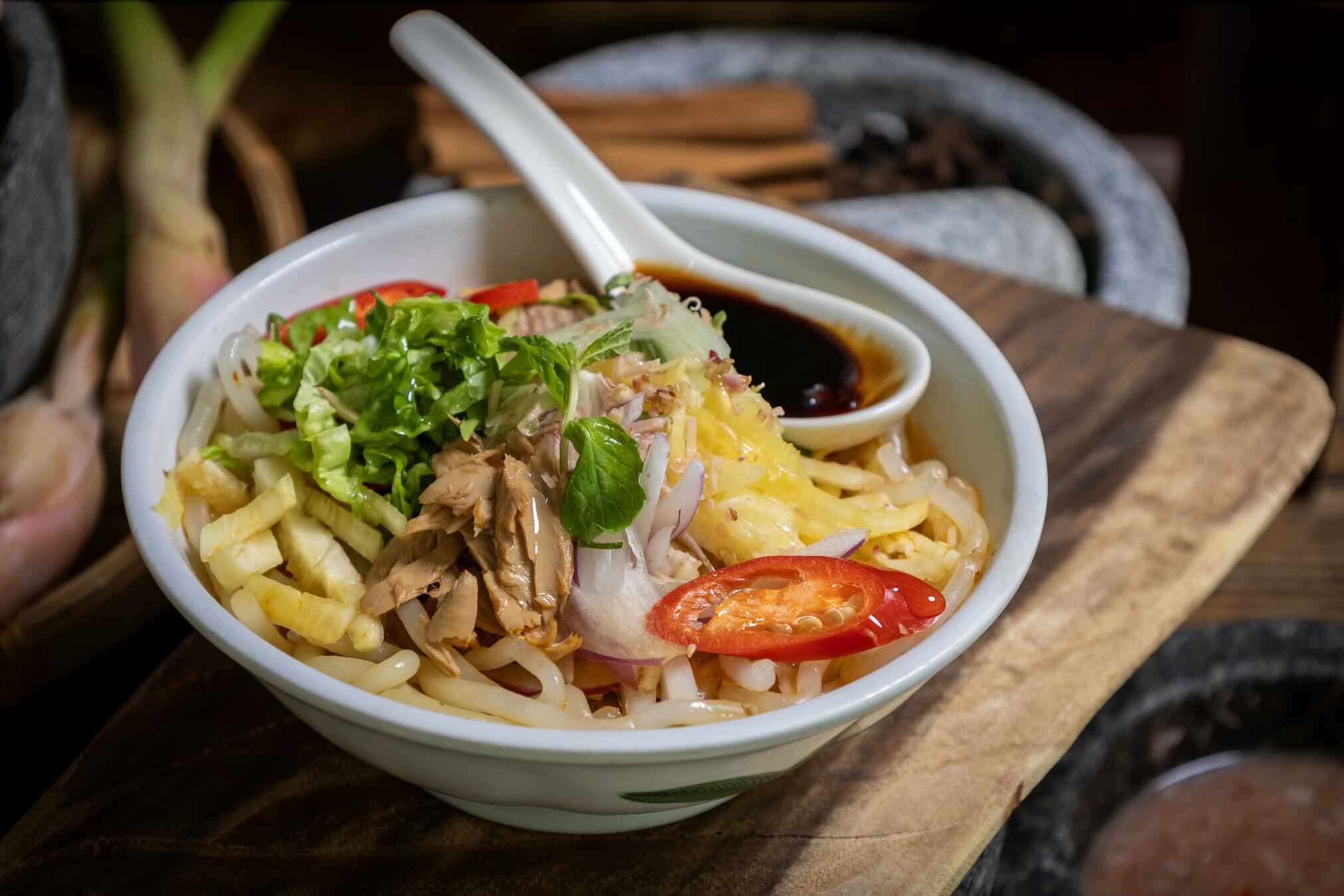 Served at Ginger’s “Hawker Stall” section, this unassuming bowl of pale broth conceals an addictive depth of umami. Stir in the signature chilli paste to unlock the full intensity of aromatics and savour it with prawns, tofu puffs and cockles—just like in Penang’s coffee shops.