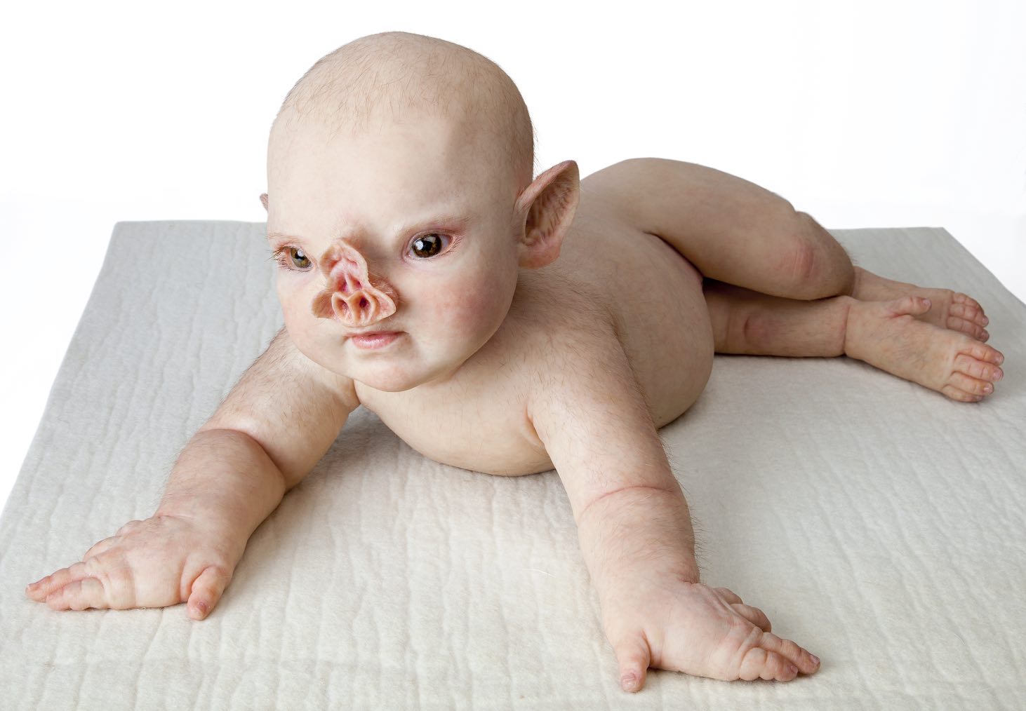 Several of the artworks in the exhibition emphasise the bioethical challenges associated with humankind’s manipulation of nature, highlighting relevant issues such as existence, climate change and technology. The show explores Piccinini’s use of silicone, fibre glass, resin, and unorthodox components like human hair, all woven together to create her hyper-realistic creations. Despite appearing unsettling and alien, the sculptures in the exhibition have a surprising warmth. Piccinini’s artworks are juxtaposed in unusual ways, creating intimate narratives depicting her hybrid creatures interacting in loving and empathic ways.