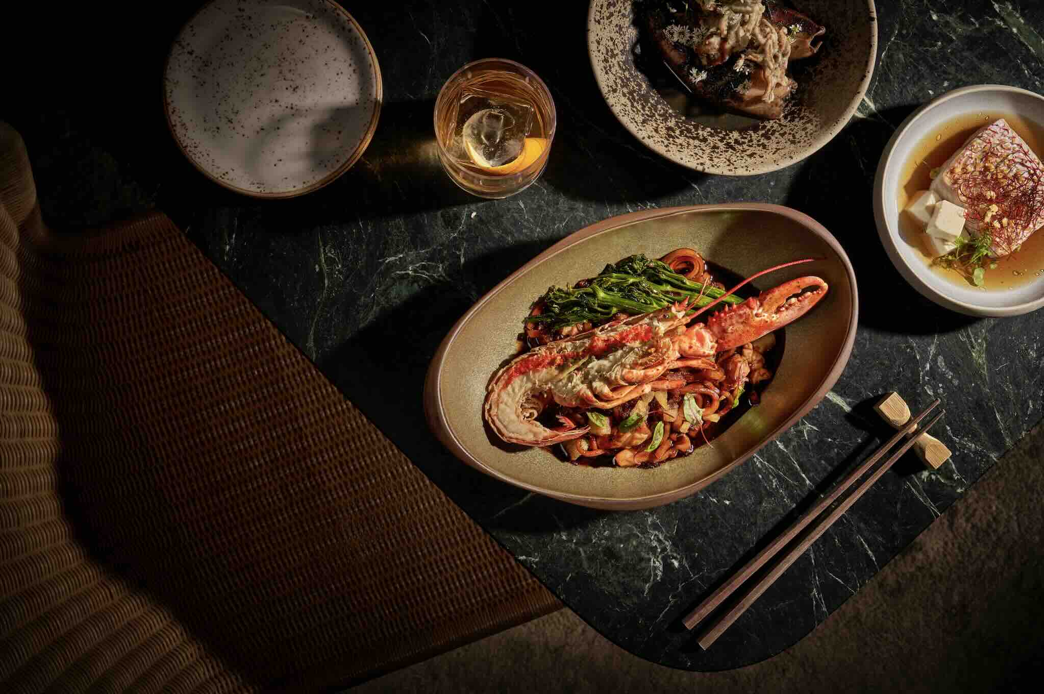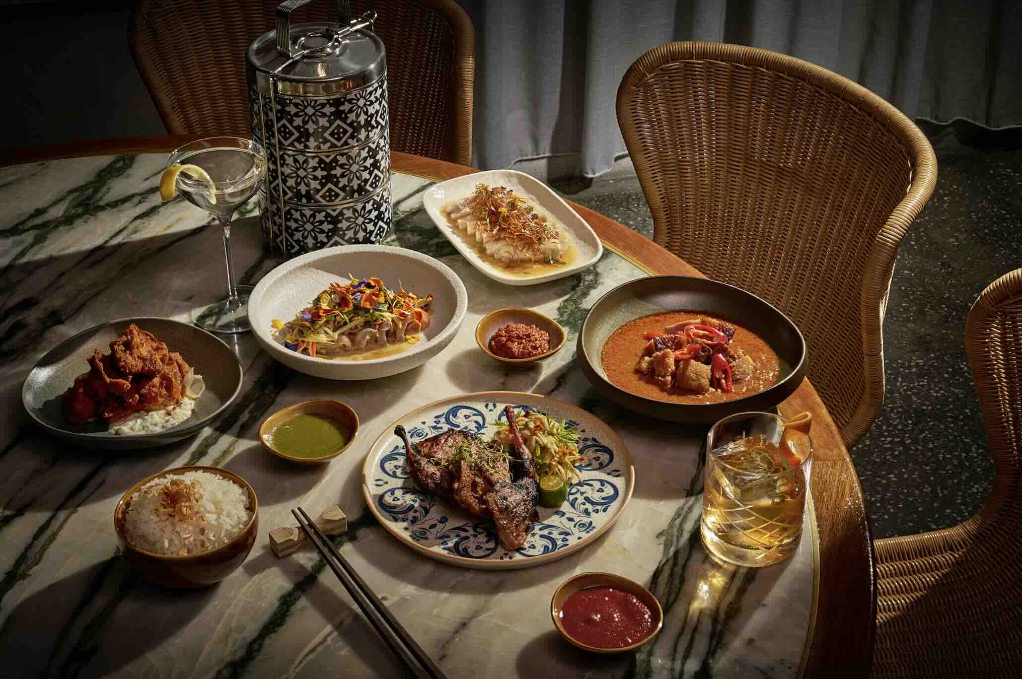 Start with the Crispy Oysters, coated in assam aioli and tobiko, or the Wagyu Brisket Rendang served with grilled sweet corn roti. Dishes like Ayam Pelencheng — kampong chicken marinated in shrimp paste, fermented soy bean and lemongrass — reflect layered Nanyang traditions. For grilled mains, the Charcoal-Grilled Ribeye Satay (with buah keluak sambal) and the Red Grouper Assam Curry bring bold heat and depth.