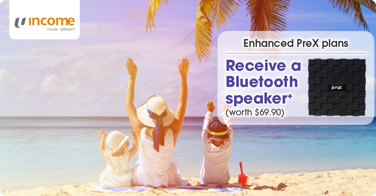 From now until 15 August 2016, you will receive a Bluetooth Speaker+ (worth $69.90) when you sign up for either Enhanced PreX Superior plan or Enhanced PreX Prestige plan by Income, with a minimum spent of $130 per transaction. Enter or quote PreX16 before making payment!
