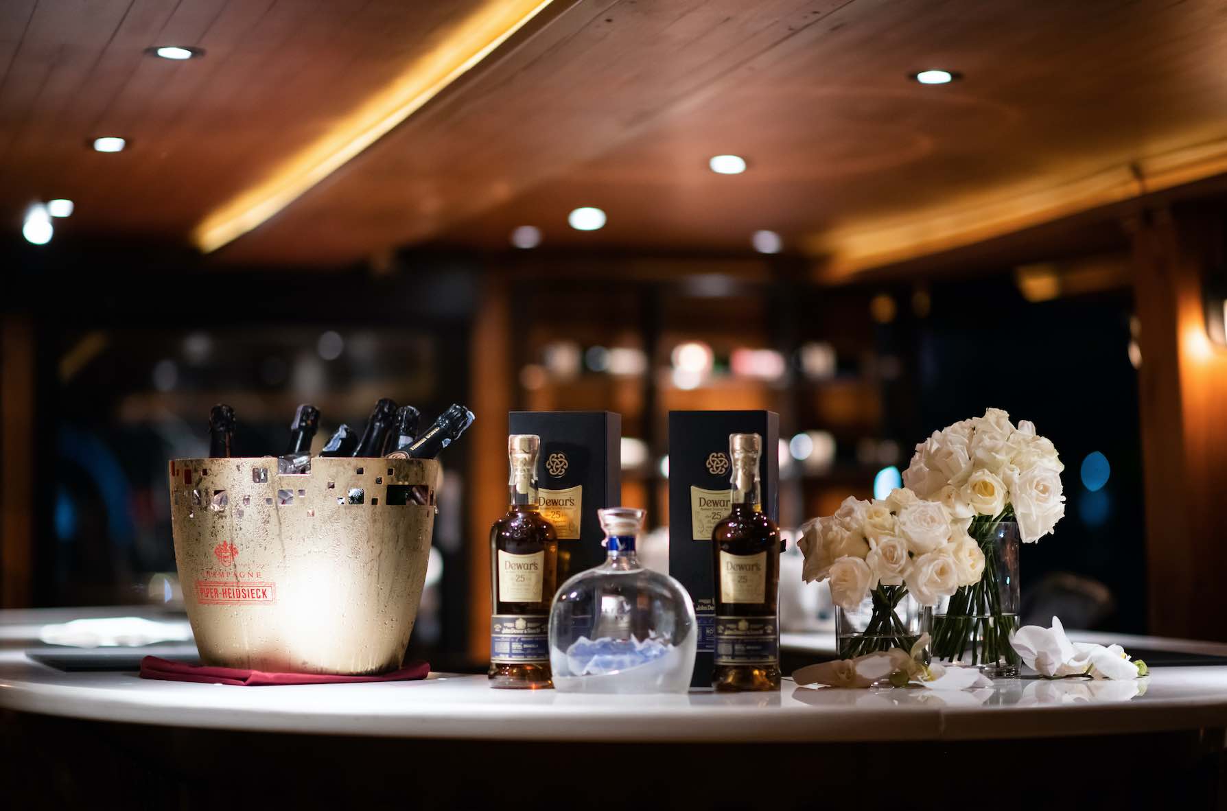 Your journey begins at the horseshoe-shaped, marble-topped Champagne bar, stocked exclusively by Piper-Heidsieck. As you sip your drink, make your way across the first floor, which opens up into a luxurious lounge room — air-conditioned, of course — with wall-to-wall glass windows for stunning panoramic views.