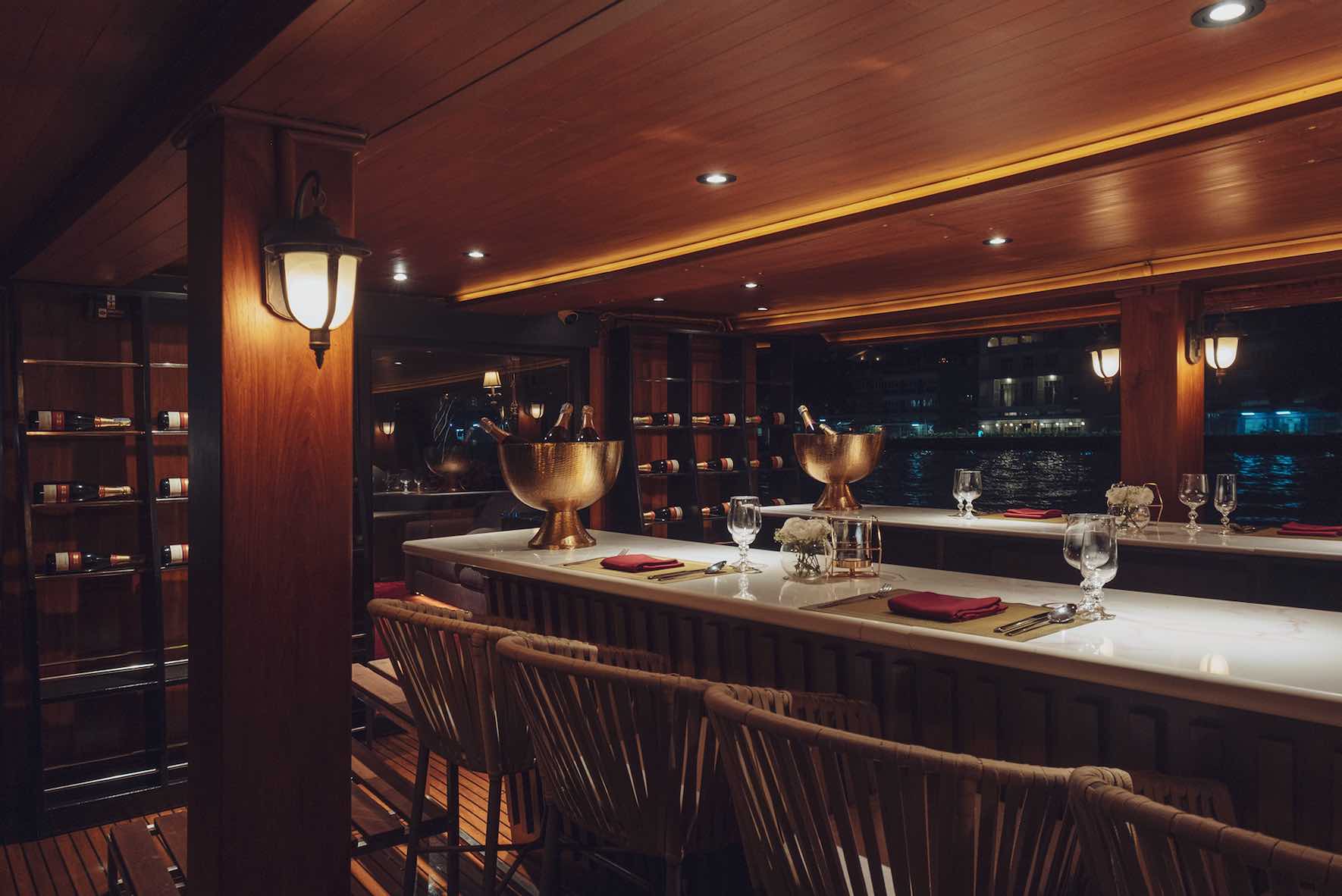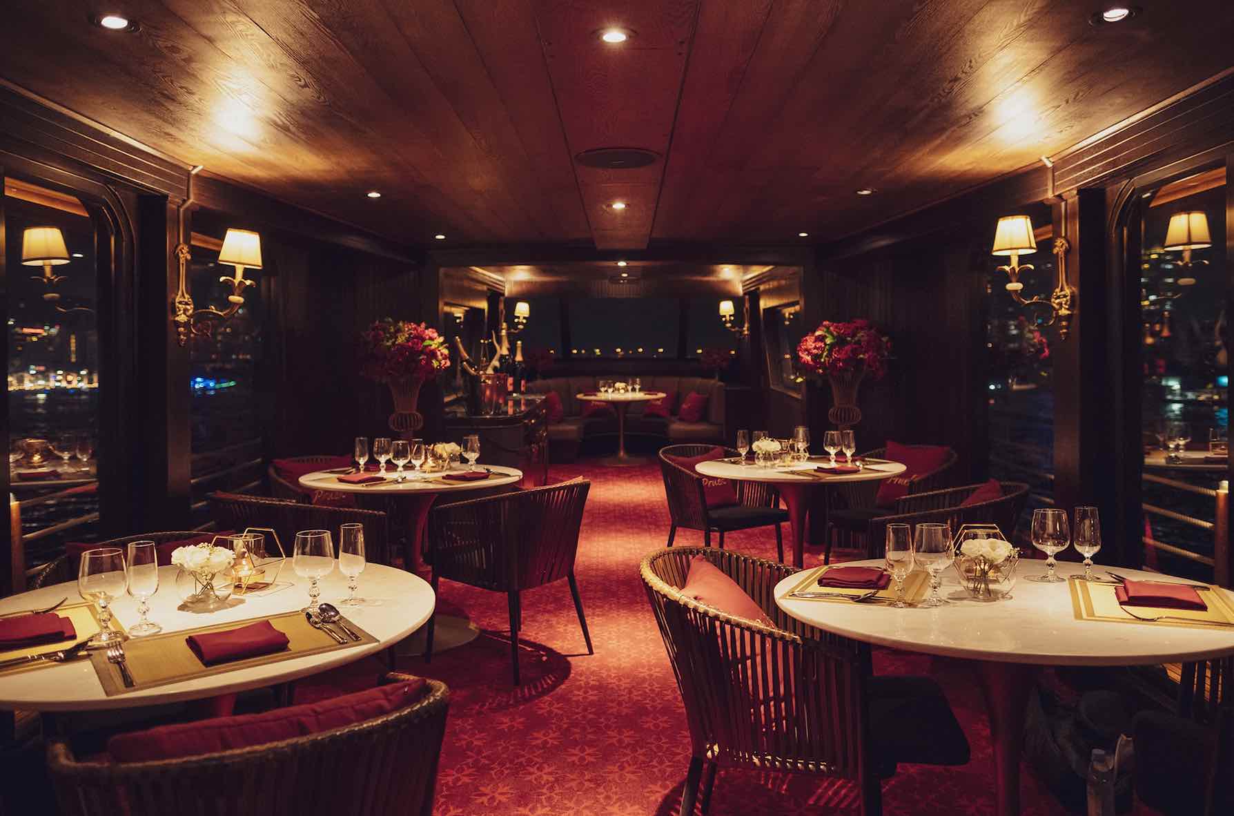 Drink in hand, head upstairs to the second-floor dining area, outfitted with both outdoor and air-conditioned spaces for an unforgettable fine dining experience. With over ten tables and an additional lounge area at the cruise bow, it’s the perfect place to sit back, relax, and soak in the last of the evening sun.