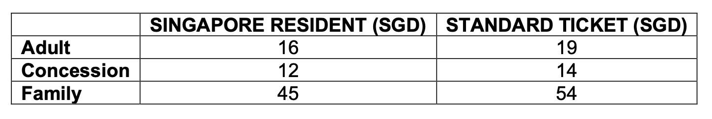 Tickets are available for purchase from 20 December at all Marina Bay Sands box offices and website. Guests are strongly encouraged to pre-purchase tickets online prior to their visit, due to limits in venue capacity. Ticket prices as follows: