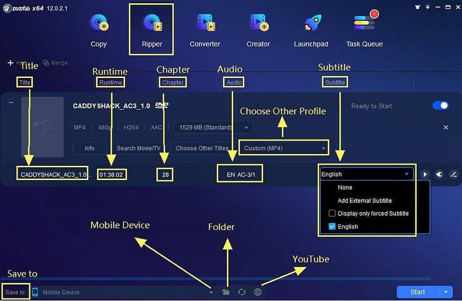 - You can also choose audio tracks; extract subtitles from DVD to SRT format, or app external subtitles.