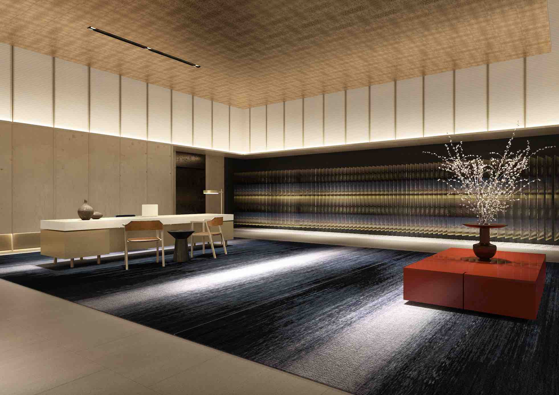 Layan Architects + Designers of Melbourne, Australia are overseeing the interior design of the guest rooms and suites, public spaces, the lobby lounge and bar, café, club lounge, and spa. The design program playfully weaves in references to Hakata-ori, the yarn-dyed weaving tradition of Fukuoka, in the lighting fixtures, flooring, and decorative fittings. A three-dimensional piece of wall art in the first-floor arrivals lobby, for example, is rendered of thousands of pattern-dyed threads, while the carpet takes inspiration from the look and texture of Hakata-ori textiles. Light fittings recall the patterned punch cards of weaving machines.