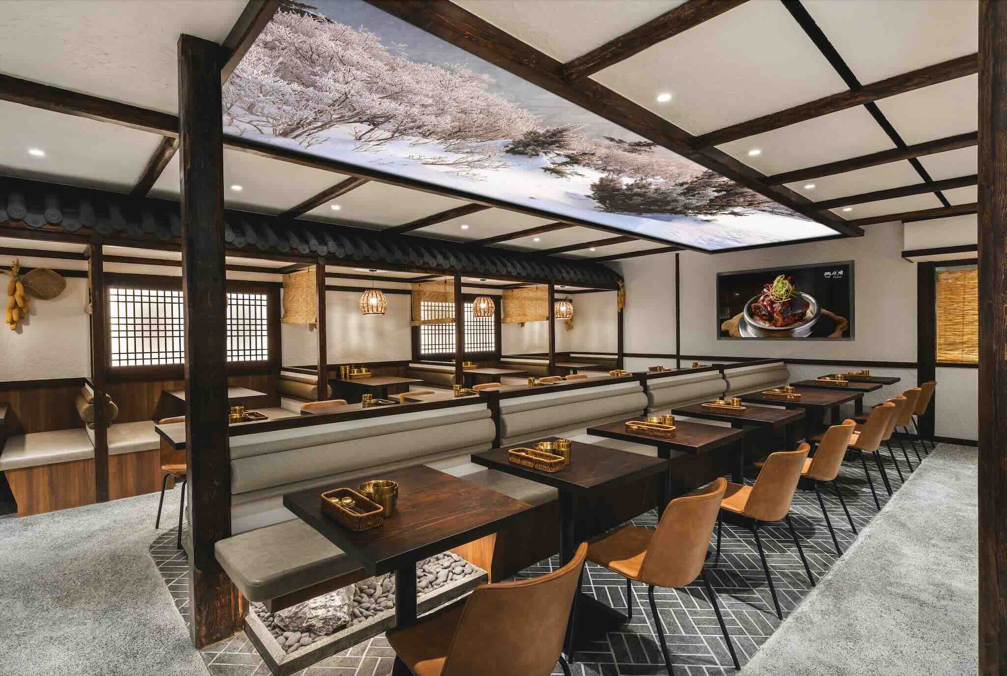 The interior design of the new Wheelock Place outlet takes inspiration from Korea’s rich architectural heritage. You will be greeted by a large LCD ceiling display, showcasing vivid seasonal visuals that are reflective of the restaurant’s name, Sagye (사계), which means ‘four seasons’ in Korean. The design also features traditional hanok-inspired décor, with elements such as bamboo curtains, lamps, Hangari pots, and a cosy fireplace, creating a warm and inviting atmosphere that evokes the charm of a traditional Korean tavern, or joomak.