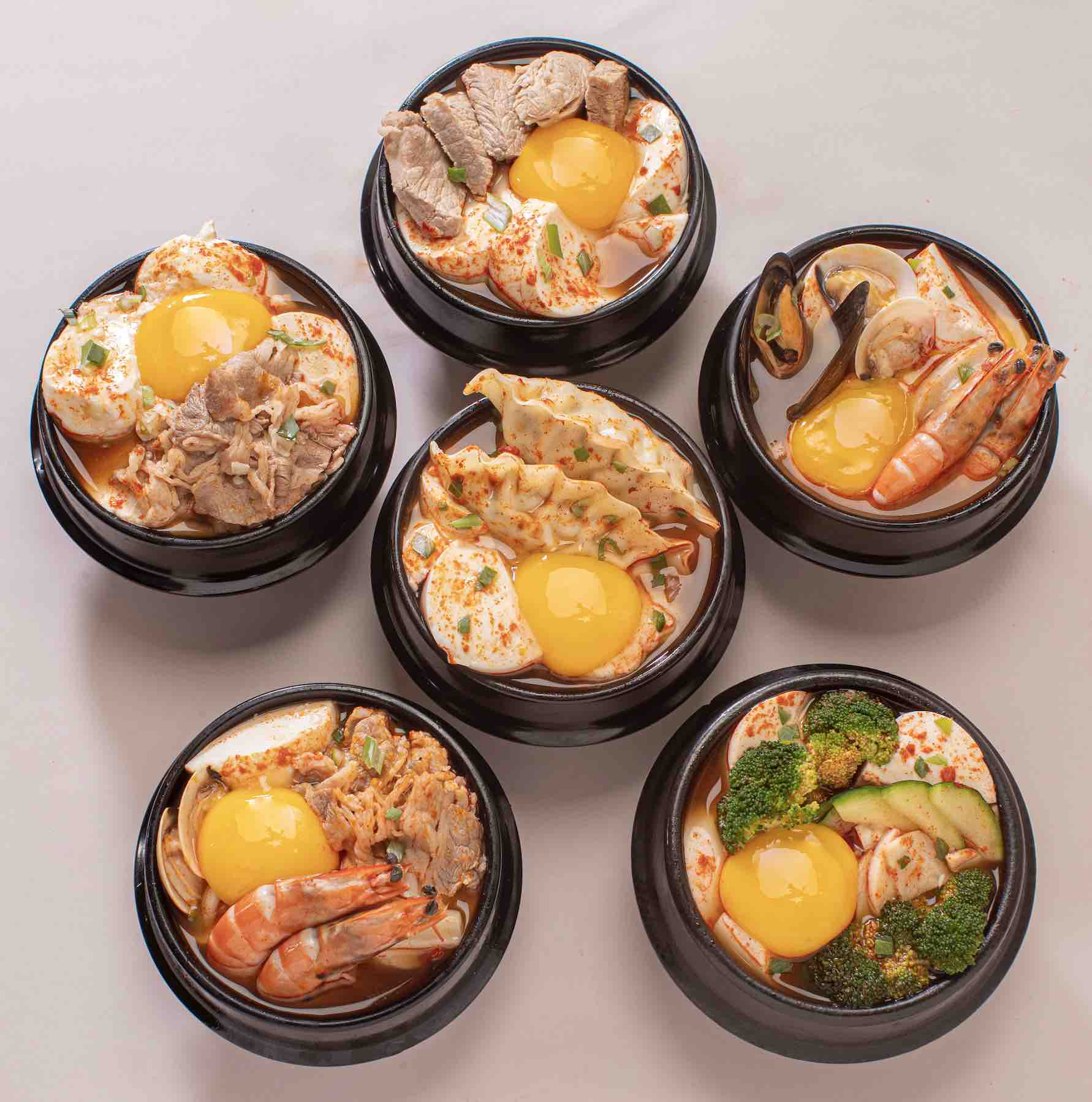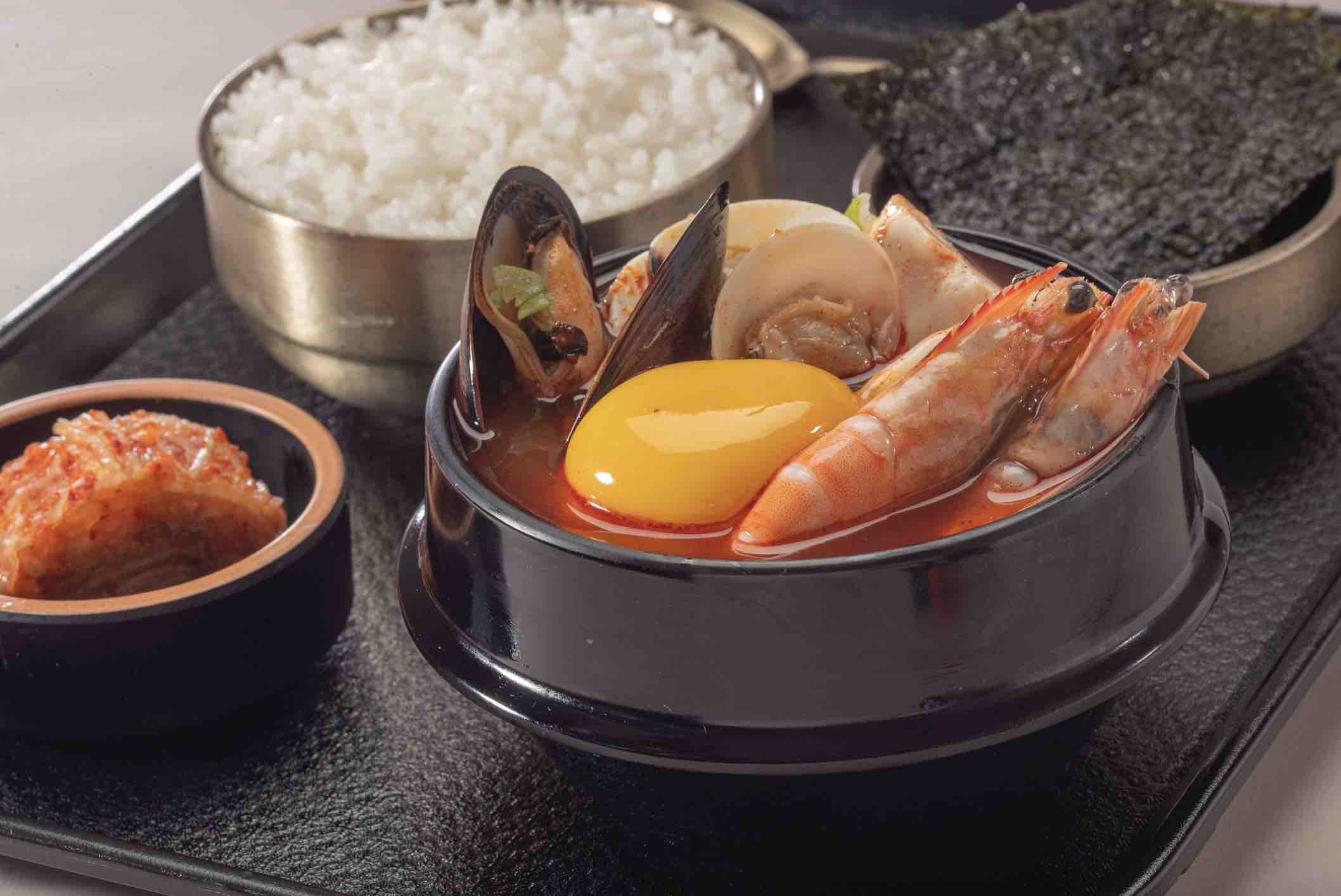 Customers can choose from six types of soft tofu sets, all of which comes with kimchi, rice and a pack of Korean seaweed.