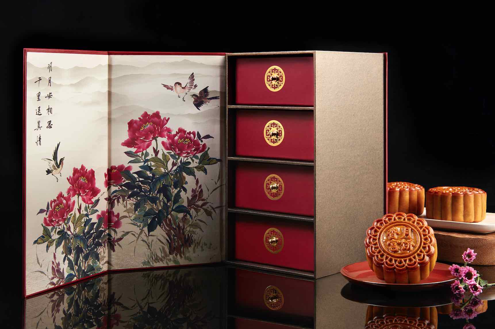 For those get-togethers with discerning traditionalists, bring baked mooncakes packed in a box that is either a nostalgic red or elegant turquoise. Both are patterned with flowers in full bloom to represent the bountiful harvest that the festival celebrates.