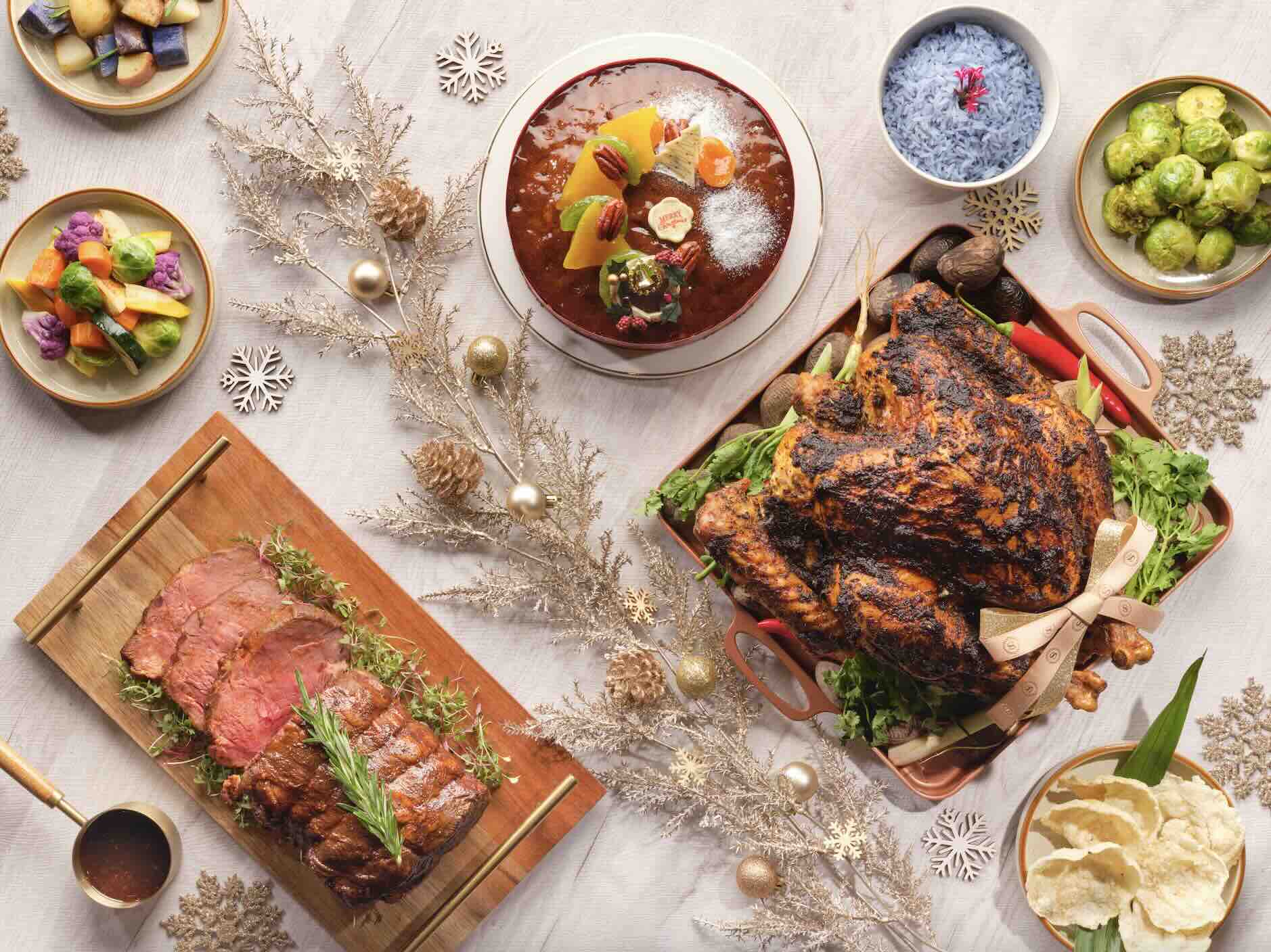 The Dining Room presents a resplendent ensemble of festive takeaways for the planning of hassle-free celebrations in the cosy comfort of home. The new Butternut Pumpkin Lobster Bisque ($42) is the perfect starter of any gatherings. A delicious centerpiece for the party table, the new Black Diamond Roasted Turkey ($208) is a Peranakan-inspired rendition of the Christmas staple. The turkey is marinated with a generous amount buah keluak paste before being slow roasted to perfection, and served with blue pea flavour basmati rice, sautéed brussels sprouts with sambal hijau (green chilli) and emping crackers (bitternut cracker).