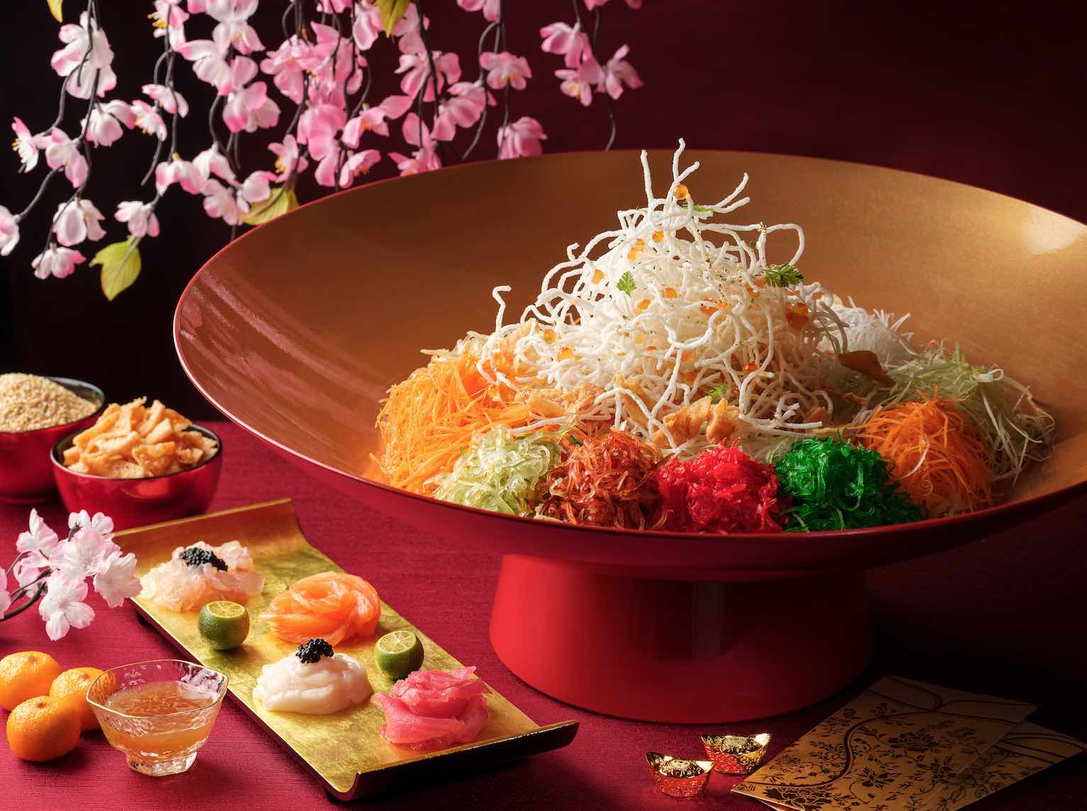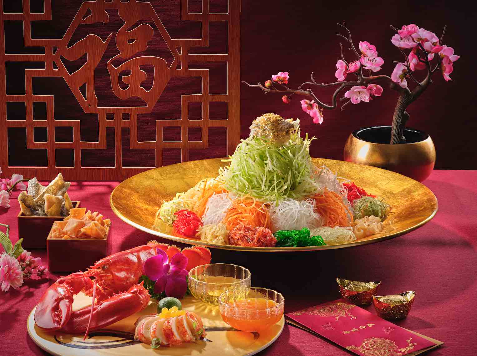 Toss to an auspicious year with a choice of Lobster, Scallop, Salmon, Tuna, Caviar & Crispy Fish Skin Yu Sheng (至尊鱼生捞起) (Large: $268++); Boston Lobster (Cooked) & Caviar Yu Sheng (鱼子酱波士顿龙虾捞起) (Large: $188++, Small: $108++); Mini Abalone & Crispy Fish Skin Yu Sheng (千孙鲍鱼捞起) (Large: $158++, Small: $88++); Smoked Duck Breast & Crispy Fish Skin Yu Sheng (熏鸭胸捞) (Large: $128++, Small: $68++); Pear & Avocado Vegetarian Yu Sheng (雪梨养身鱼生) (Large: $128++, Small: $68++).