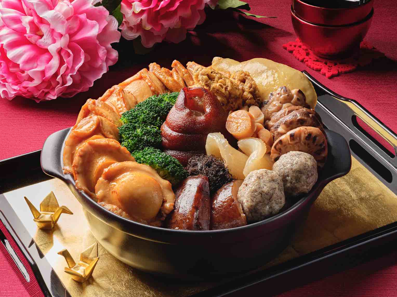 Also in the spotlight is Wan Hao Imperial Pot of Prosperity Pen Cai with Australian 3-Head Abalone & Goose Feet 盆满钵满 (黄金盆菜) ($688++/6 persons) / ($1088++/8 to 10 persons). Suitable for the whole family with 14 luxuriant ingredients that symbolise goodness and auspicious meanings, experience the taste of opulence that will leave your mouth watering. A gastronomical centrepiece perfect for your Lunar New Year gatherings, this pot of treasure tantalises your palate with 3-Head Australian Abalone, Sea Cucumber, Fish Maw, Conpoy, Crispy Dried Oyster, Goose Feet, Drunken Chicken, Whole Pork Trotter, Black Moss Dace Fish Paste, Baby Chinese Cabbage, Black Moss, White Radish, Beancurd Skin and Broccoli.