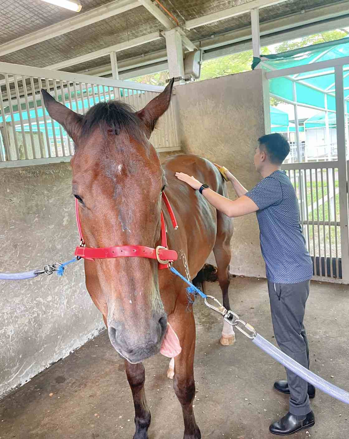 After the ride, we will need to give High Street a good bath before returning back to the stable. Compared to mounting, getting off was much easier by just sliding down from the horse but it still takes a leap of faith. When I was washing his head, High Street kept putting the hose into his mouth to drink from it. At first, I thought he was feeling thirsty after the lesson but Ruben jokingly said High Street probably did not sweat much from the walk as it is hardly an exercise for an ex-racehorse. As a young horse, he was just being mischievous.