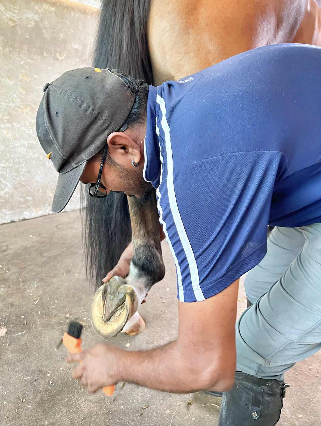 First, we cleaned his hoofs, removing debris with the Hoof Pick for a smoother trot. Once everything is dug out, use the brush to sweep the hoofs clean.