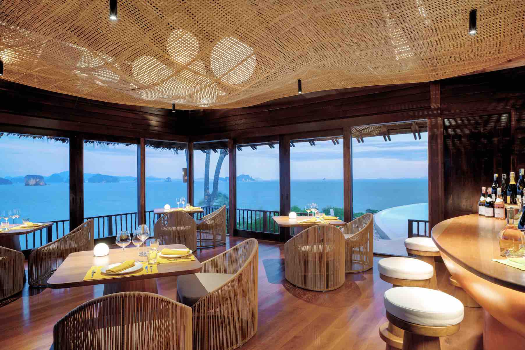 The Hilltop’s innovative new look is inspired by the nest of the Oriental Pied Hornbills, a rare species of bird that makes its home on the island of Yao Noi. From wood and woven bamboo elements to egg-shaped cushions and lamps down to fine details such as the eggshell-textured finishing of the bar, the Six Senses creative team has combined design elements, colour schemes and materials to evoke a bird’s nest perched on a treetop.