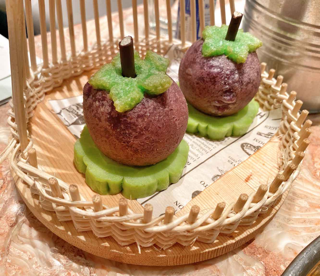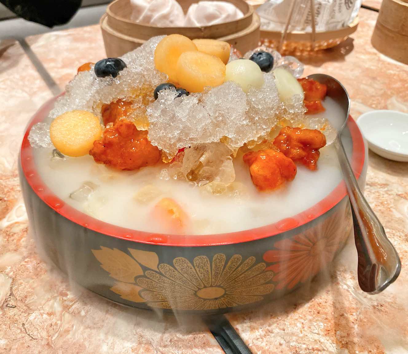 The Deep Fried Lobster Glutinous Puffs (S$7.80) is creatively shaped like mangosteen and contains crab meat cooked in lobster broth within.
