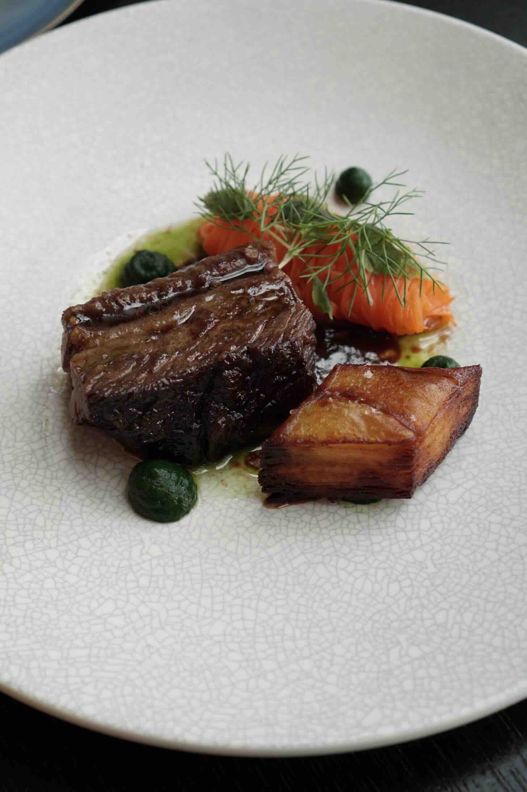 For main course, you can choose between the tender Beef Shortribs, enhanced with truffle gastrique jus, pomme pavé, and Vichy carrots, or the exquisite Black Cod, presented with leeks, shimeji mushrooms, and a fragrant soya sole nage.