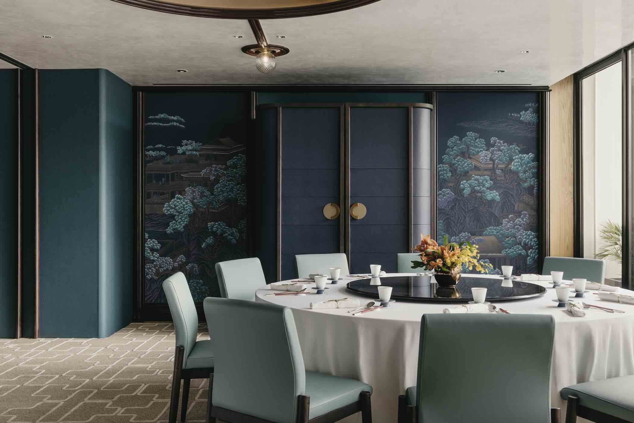 The main dining room is embraced by a foyer with a wine display and a tea bar that spotlights the sommeliers’ craft in full showmanship. Here, traditional scenes of the original Summer Palace are depicted on hand-painted wallpaper from De Gournay, complemented by aubergine lacquer and oak screens in soft pinks and pastel tones. The custom-designed carpet features a modern graphic pattern of traditional Chinese lattice, while the Venetian plaster ceiling, accented by deep aubergine beading and hand-blown custom glass fittings from Preciosa, adds a shimmering elegance. The tableware, showcasing the fine artisanship of Legle and Christofle, further enhances the refined dining experience. Two private dining rooms, seating 16 and 34 guests respectively, offer a serene and sophisticated atmosphere.
