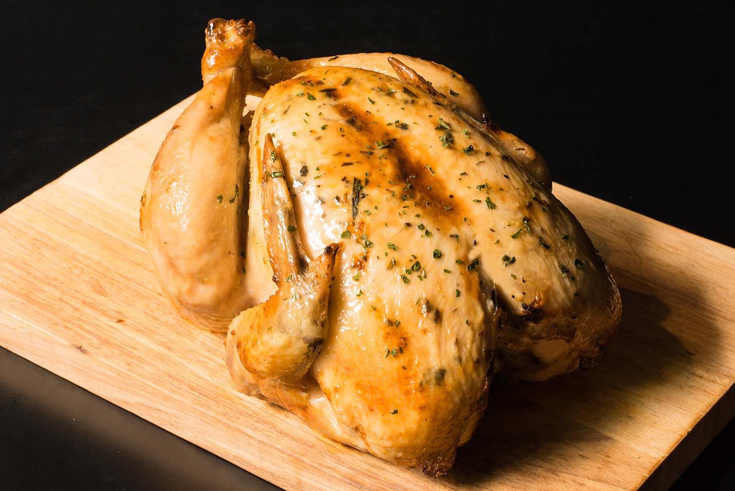 Fresh organic chicken. Brined, stuffed and trussed with a generous rub of herbs and butter. Simple chestnut stuffing. Slow roasted. Accompanied with House Gravy. *1.6kg before cooking. It is a perfect roast for a family of four with sides.