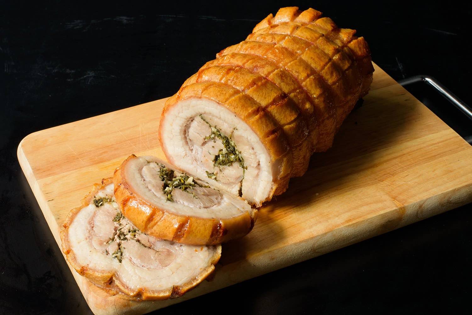 Kurobuta pork belly. Sage, thyme and garlic. Rolled into a porchetta. Meltingly tender meat and crackling golden skin. Accompanied with House Gravy. *2kg before cooking