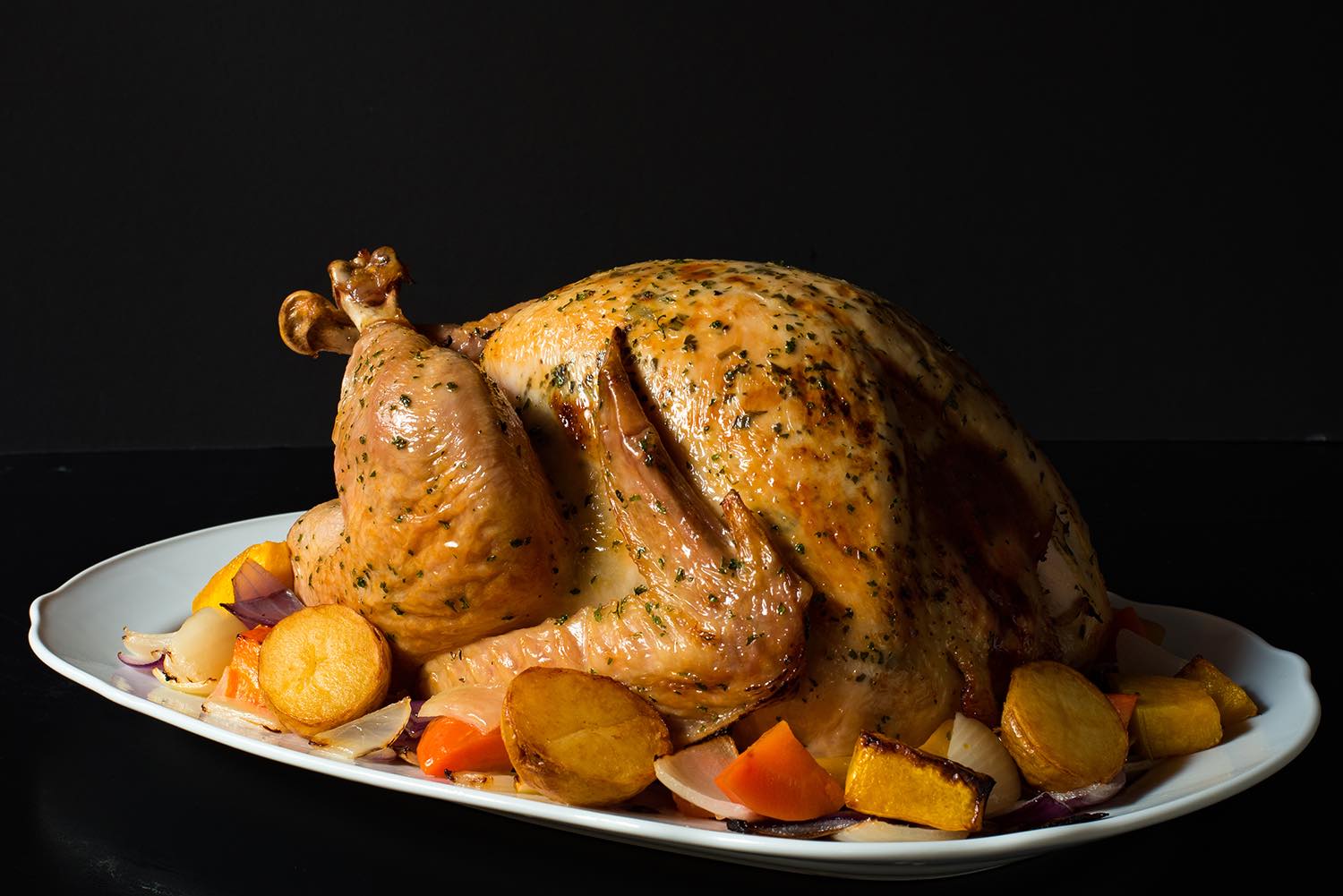 Whole young turkey. Eight to ten pounds, enough for eight to ten with sides. Butter, herbs and stuffing. Slow roasted. Accompanied with House Gravy and Cranberry Sauce.